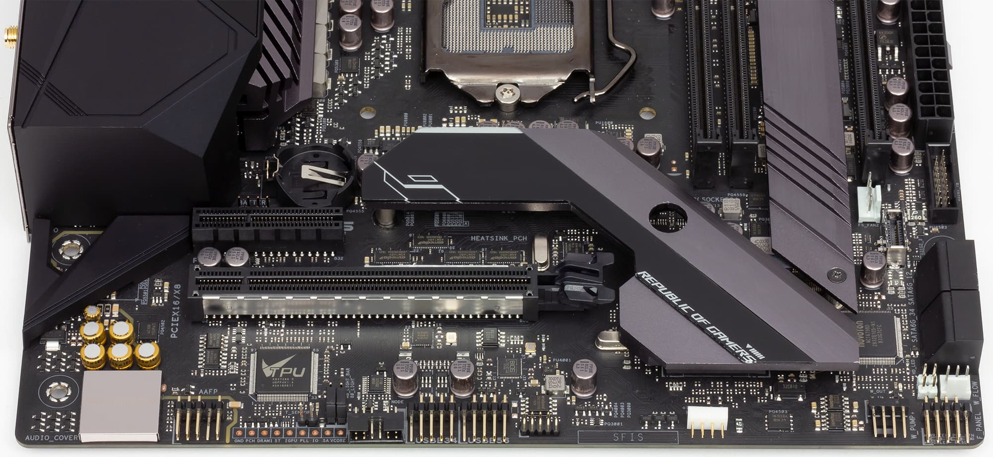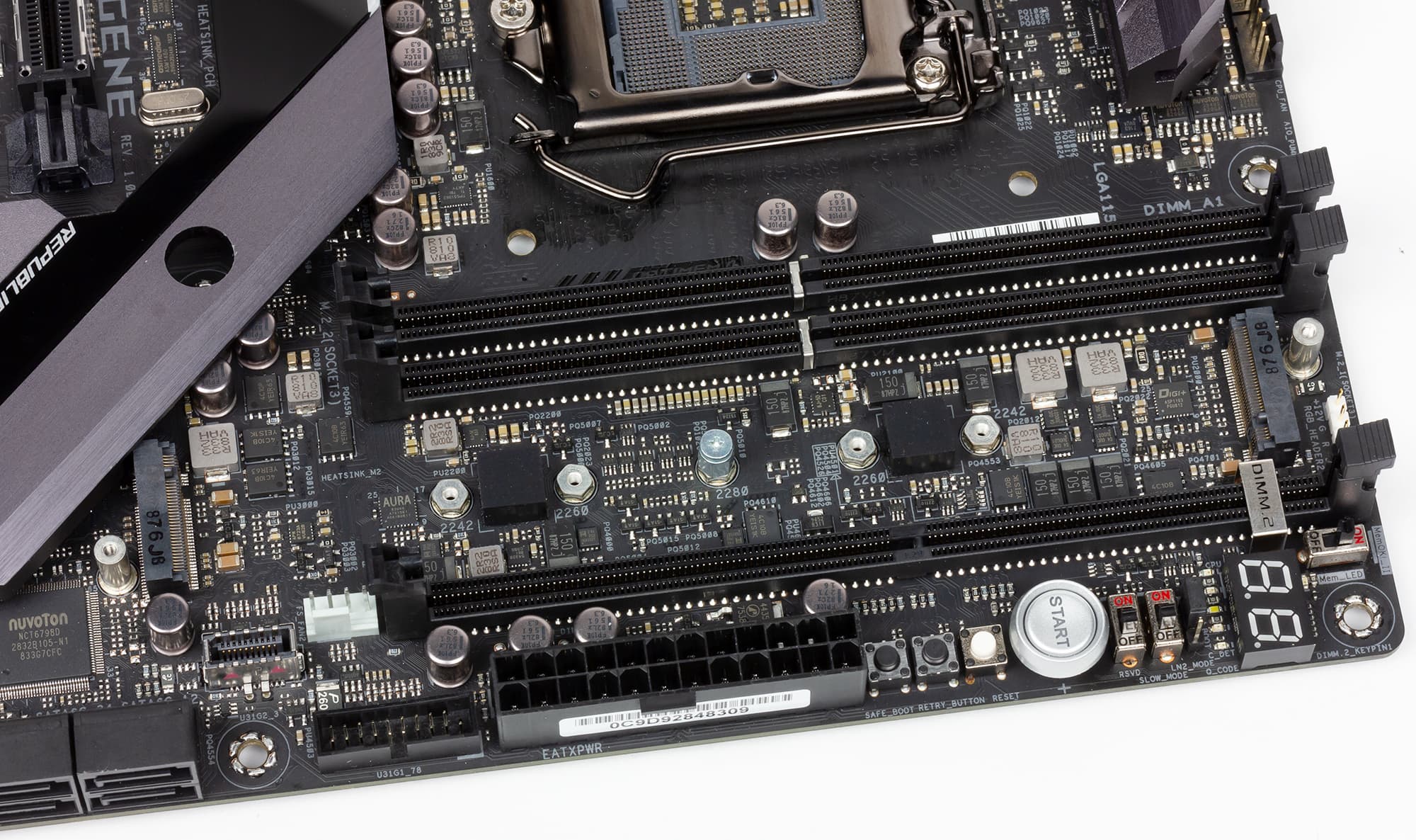 Напомним, что у процессора всего 16 линий PCIe 3.0, поэтому совместная работа слотов PCI Express 3.0 x16 и ROG DIMM.2 реализована следующим образом. Если используется только слот PCI Express 3.0 x16, то он работает в режиме x16. Если же используются и слот PCI Express 3.0 x16, и слот ROG DIMM.2, то они работают в режиме x8.