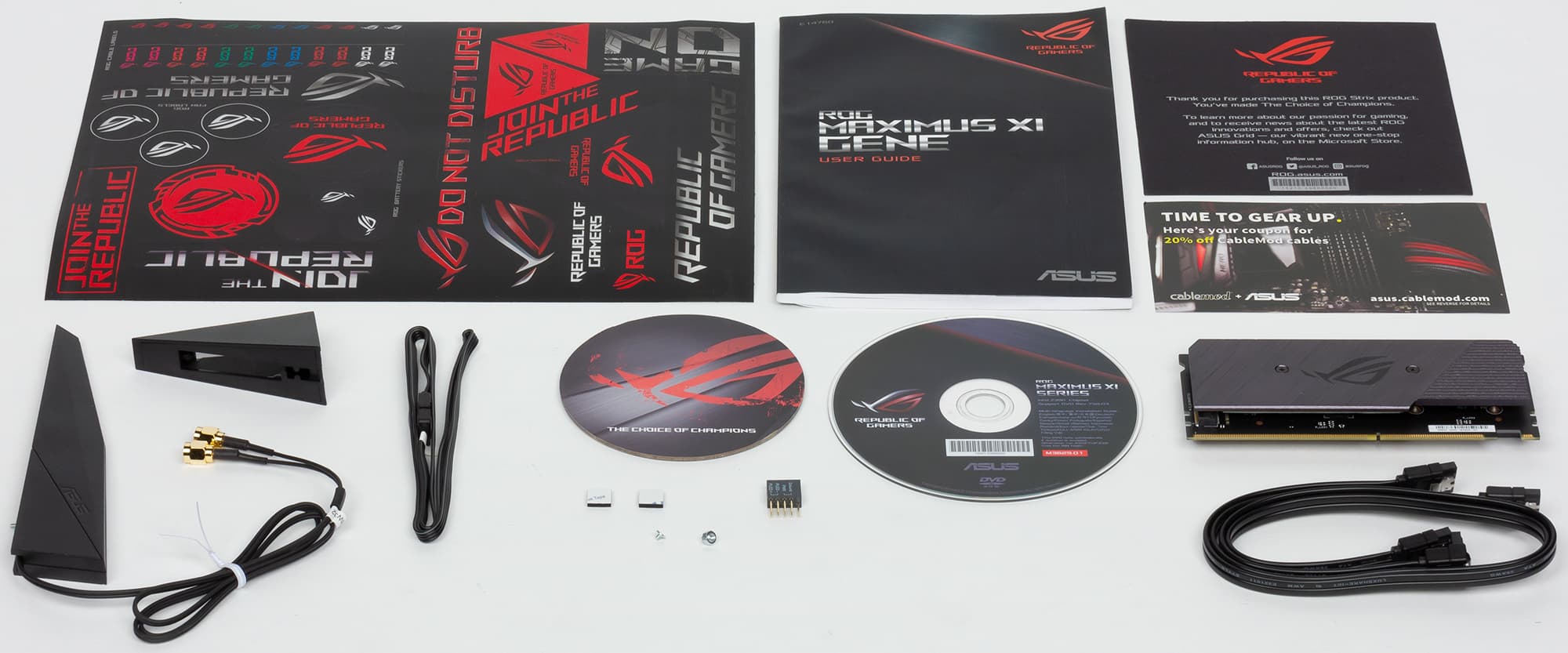 Комплект поставки включает два SATA-кабеля (все разъемы с защелками, один кабель с угловым разъемом с одной стороны), руководство пользователя, DVD-диск с программным обеспечением и драйверами, антенну встроенного Wi-Fi-модуля, кабель-переходник для подключения светодиодной ленты, различные стикеры в изобилии, а также модуль ROG DIMM.2 на два SSD-накопителя.