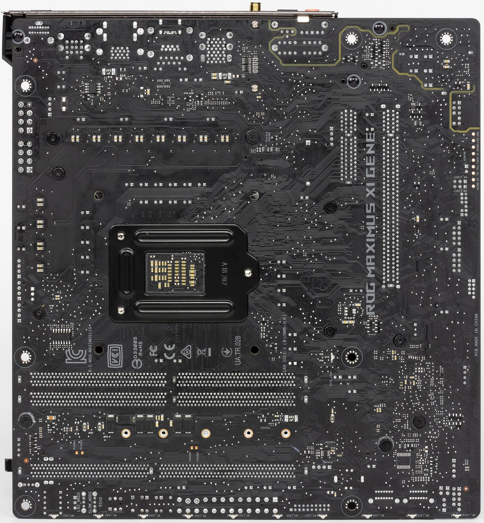 Плата ROG Maximus XI Gene выполнена в форм-факторе microATX (244×226 мм), для ее монтажа в корпус предусмотрено семь отверстий.