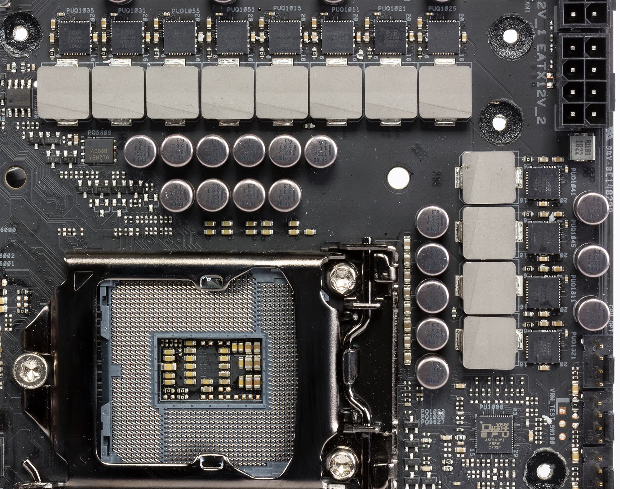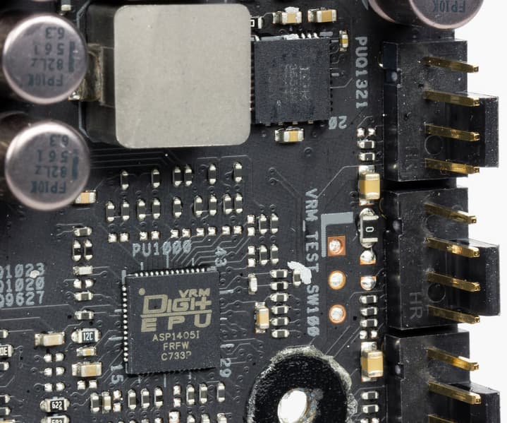 Регулятор напряжения питания процессора на плате является 10-канальным и управляется контроллером с маркировкой ASP1405. В каждом канале питания используется по одному чипу IR3555M (International Rectifier), который объединяет в себе два MOSFET-транзистора (High и Low), а также MOSFET-драйвер.