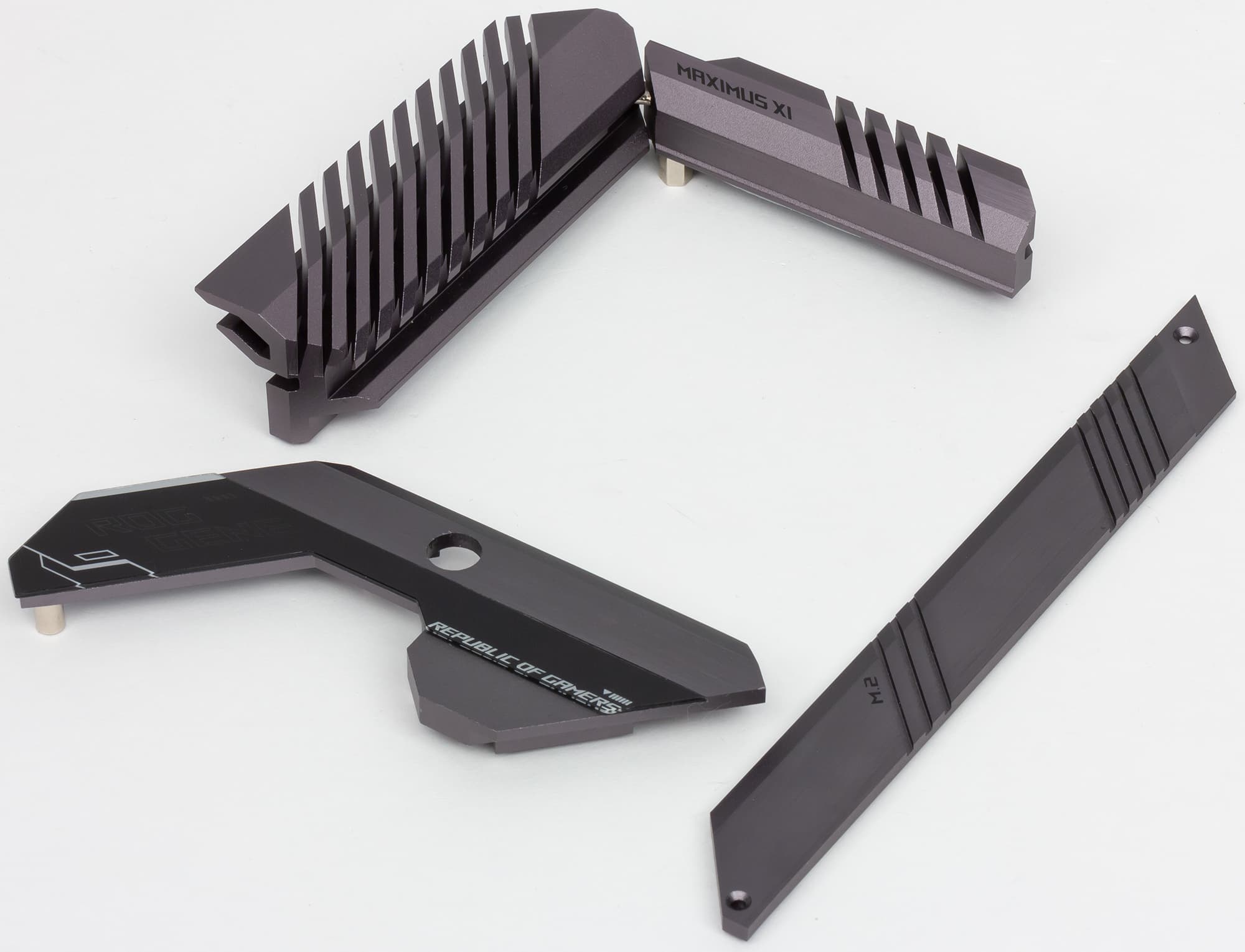 Система охлаждения платы ROG Maximus XI Gene состоит из нескольких радиаторов. Два радиатора, связанные тепловой трубкой, расположены по двум смежным сторонам процессорного разъема и предназначены для отвода тепла от элементов регулятора напряжения питания процессора. Еще один радиатор предназначен для охлаждения чипсета.