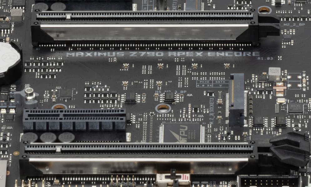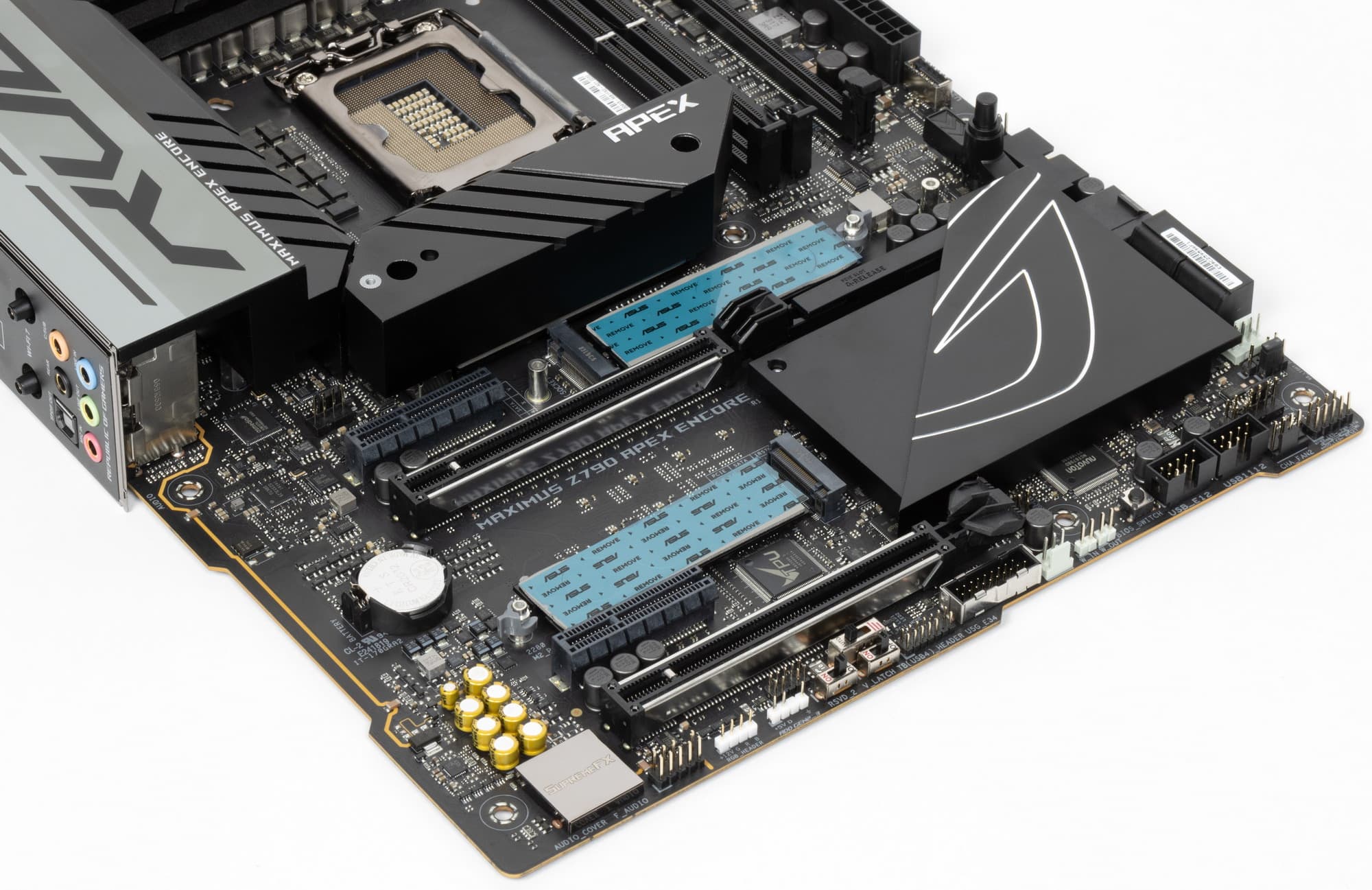 У Asus ROG Maximus Z790 Apex Encore имеется 19 портов USB разных видов, включая 8 очень быстрых USB 3.2 Gen2, а также два USB 3.2 Gen2×2 (в виде Type-C на задней панели и внутреннего Type-C, через который можно заряжать мобильные устройства в режиме быстрой зарядки). Плата предлагает 4 слота PCIe х16, два из которых получают от процессора 16 линий PCIe 5.0, а третий и четвертый работают в режиме х4. Также у платы 5 слотов M.2: два подключены напрямую к процессору (один — линиями PCIe 5.0, второй — PCIe 4.0), три других подключены к чипсету Z790 линиями PCIe 4.0 (два их них размещены на фирменном модуле ROG DIMM.2). Надо заметить, что слот М.2, подключенный к процессору линиями PCIe 5.0 и готовый к установке самых современных SSD, делит ресурсы со слотами PCIe x16, переводя один в режим х8 и отключая второй.