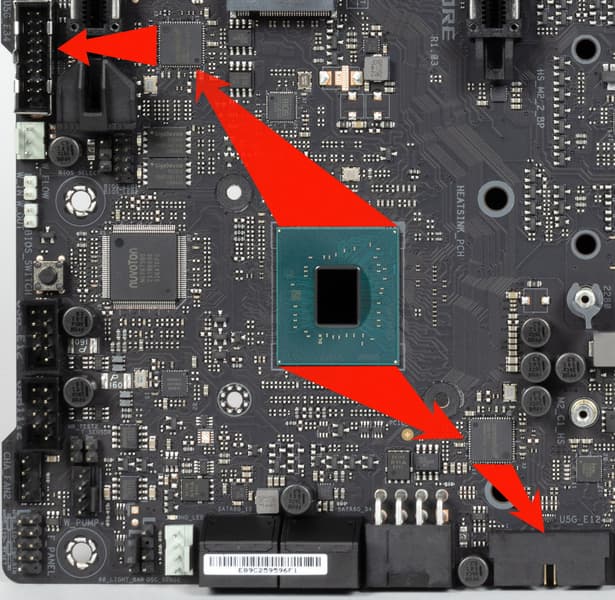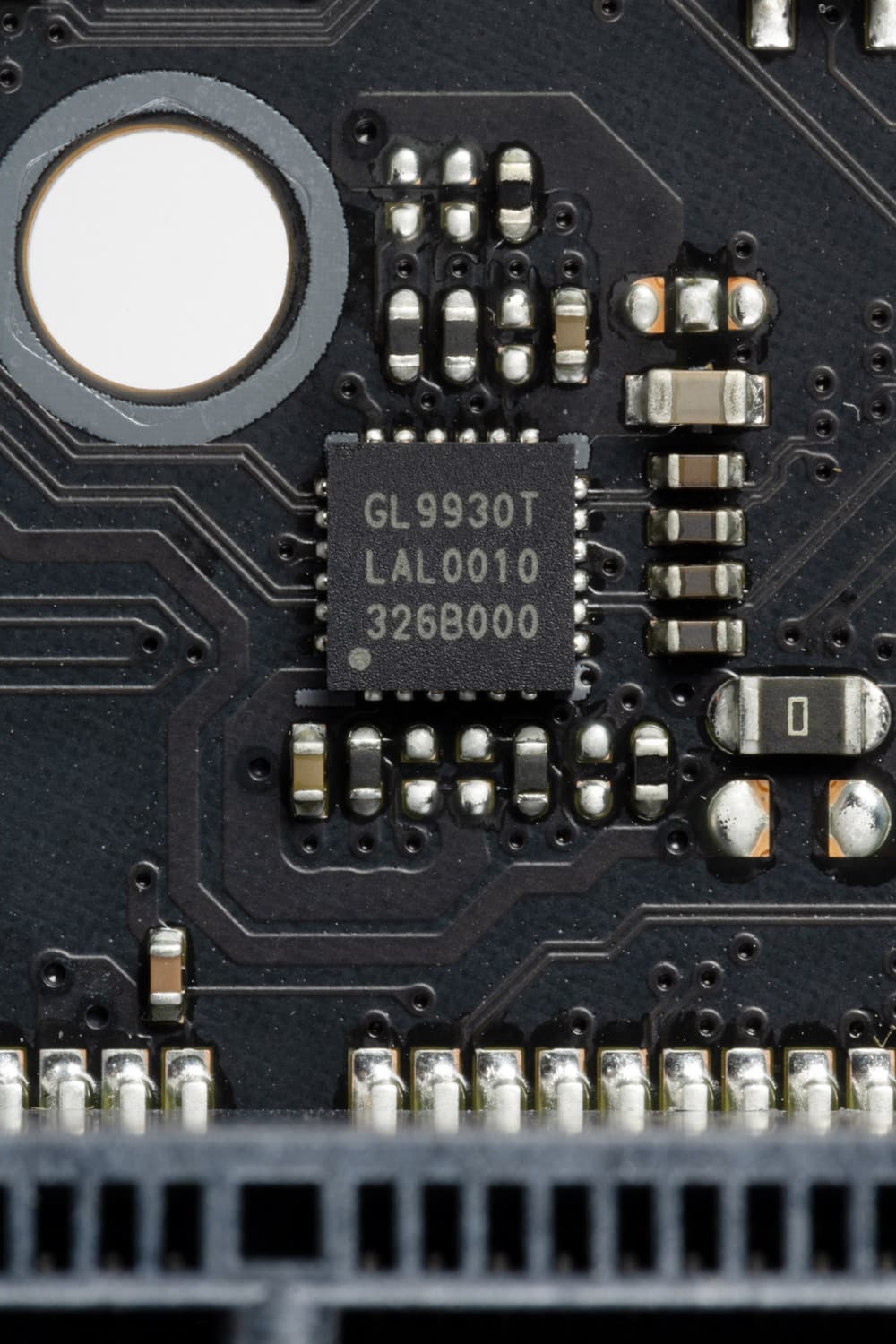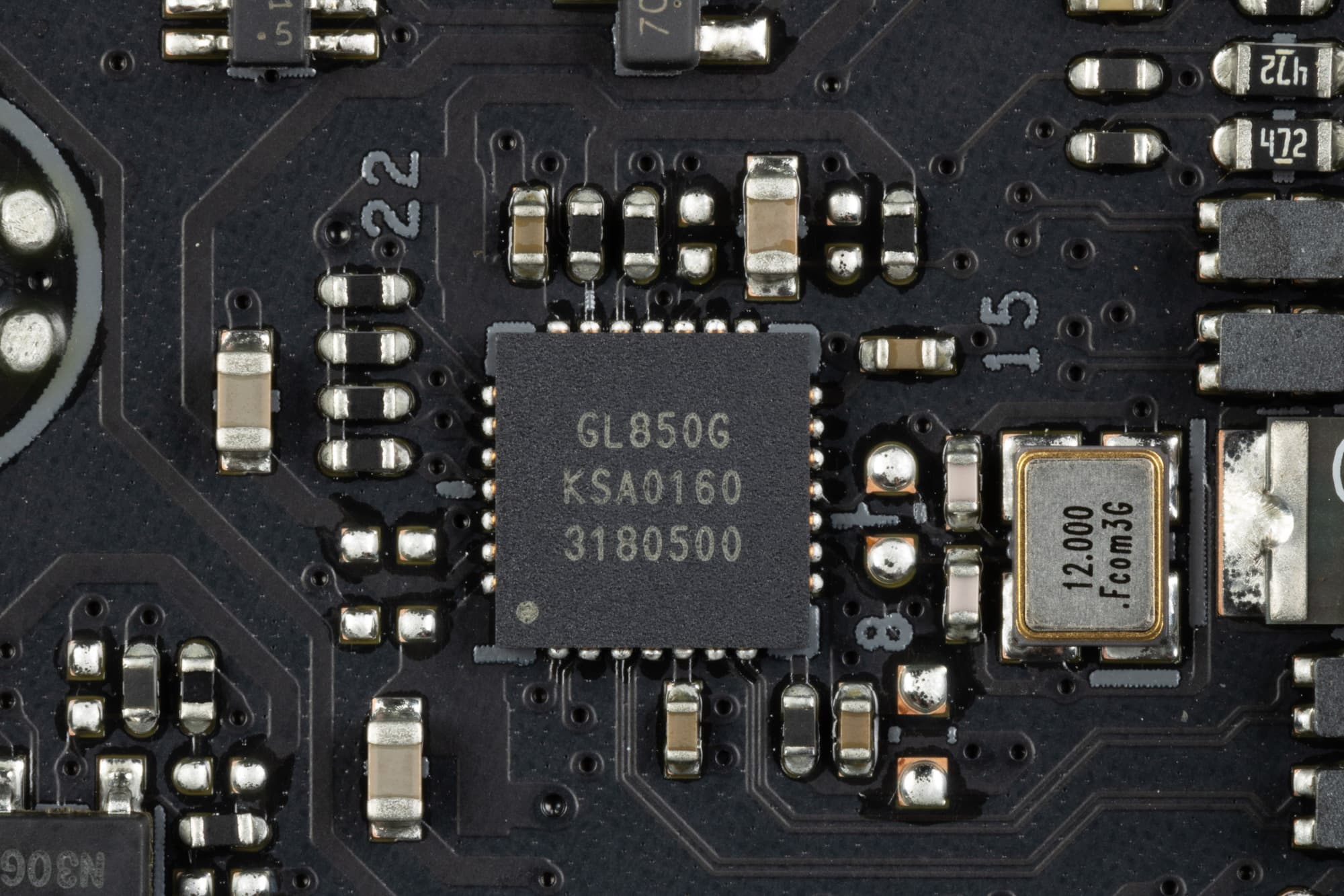 - 4 порта USB 2.0/1.1: все реализованы через контроллер Genesys Logic GL850G (на него потрачена 1 линия USB 2.0 от Z790) и представлены двумя внутренними разъемами (каждый на 2 порта).