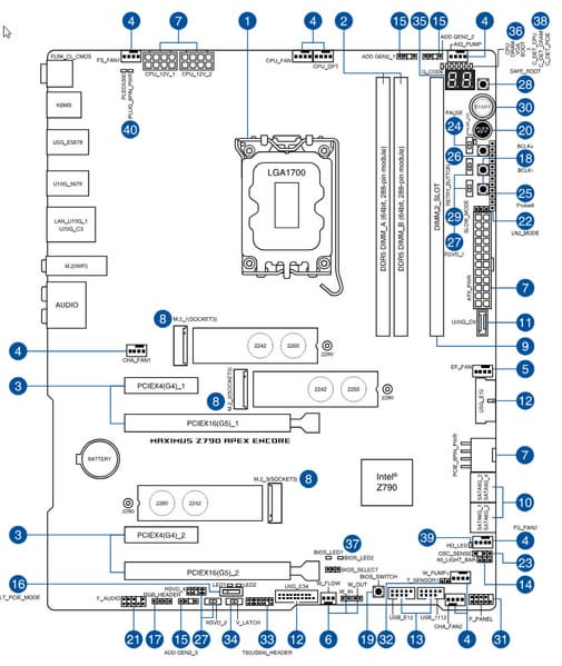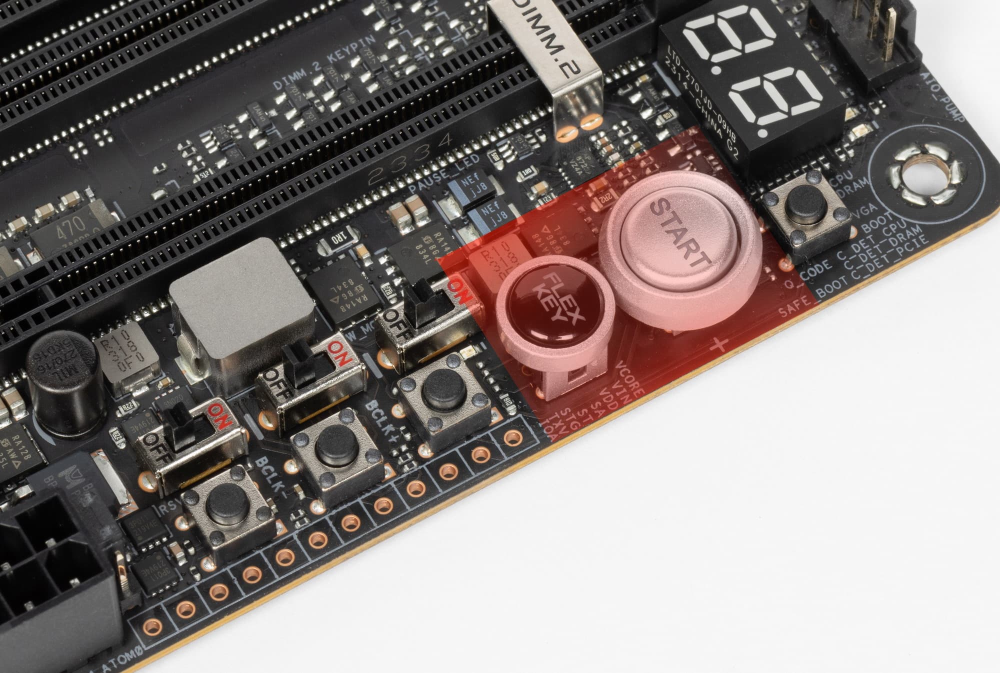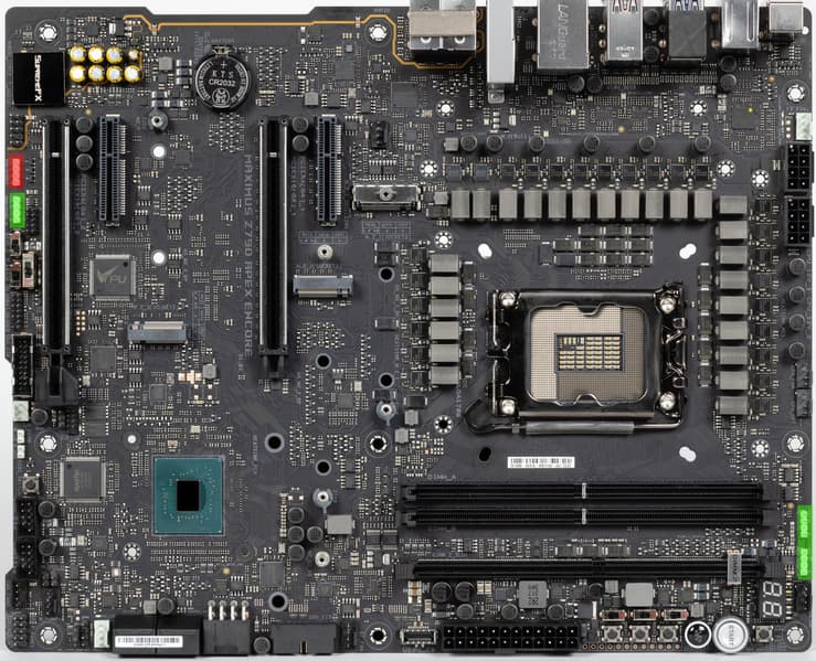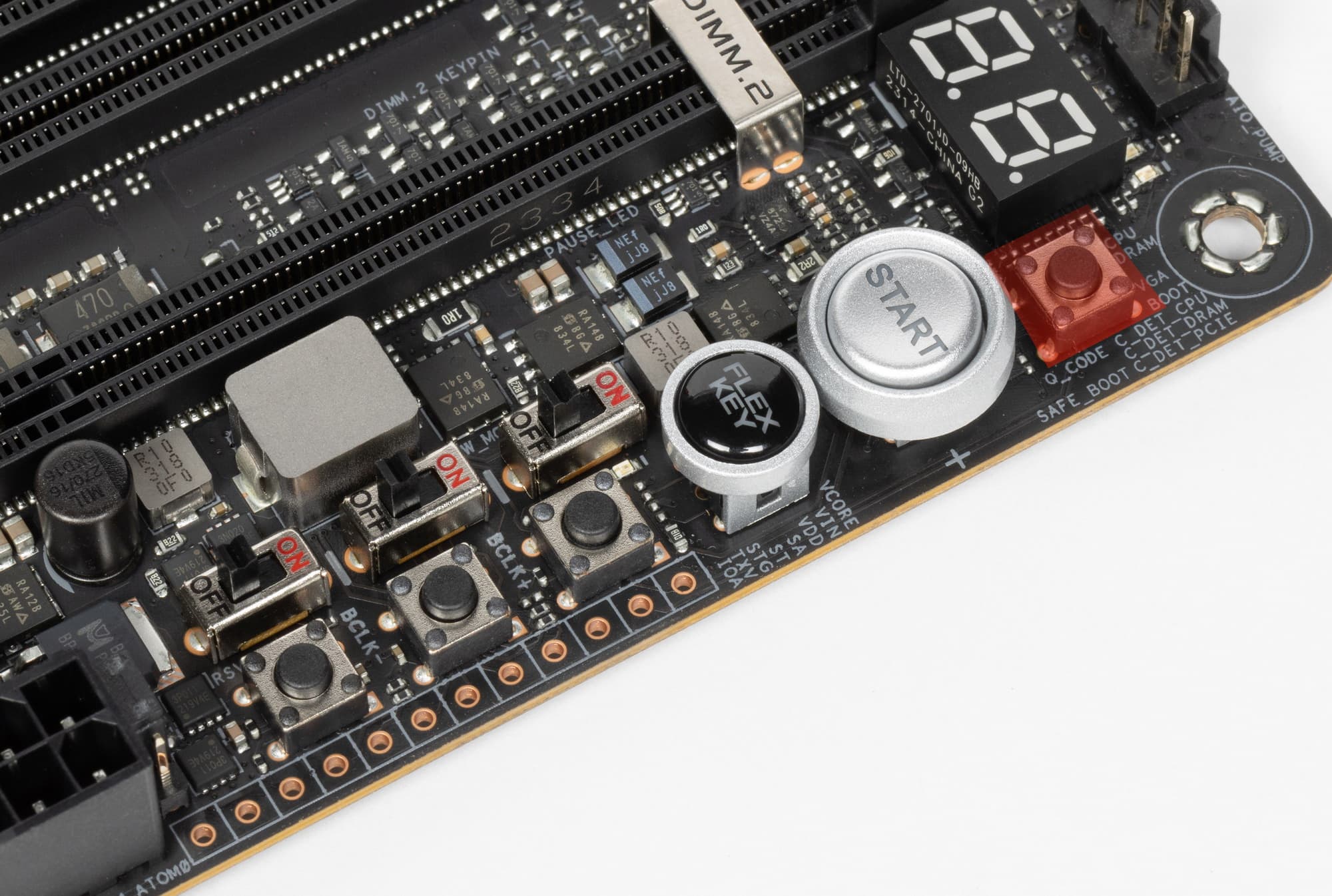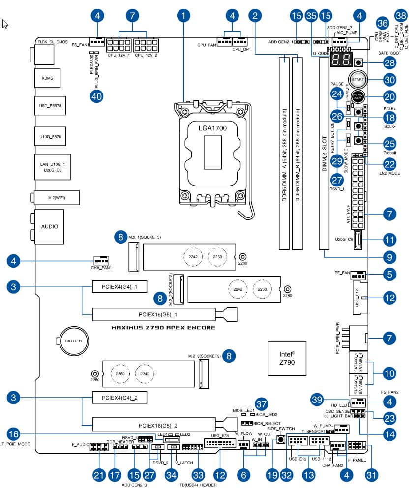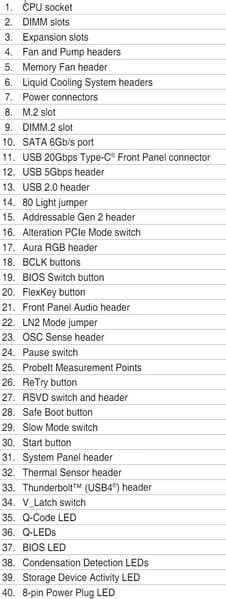 | Прочие внутренние элементы | 24-контактный разъем питания ATX 2 8-контактных разъема питания EPS12V 1 8-контактный разъем питания PCIe 1 слот M.2 (E-key), занят адаптером беспроводных сетей 1 разъем для подключения порта USB 3.2 Gen2x2 Type-C 2 разъема для подключения 4 портов USB 3.2 Gen1 2 разъема для подключения 4 портов USB 2.0 9 разъемов для подключения 4-контактных вентиляторов и помп ЖСО 1 разъем для подключения неадресуемой RGB-ленты 3 разъема для подключения адресуемой ARGB-ленты 1 разъем аудио для передней панели корпуса 1 кнопка OC Retry 1 переключатель версии PCIe 1 разъем для термодатчикa 1 разъем 80 Light Bar для отключения табло Q-Code 2 кнопки BCLK (+/-) для управления частотой шины 1 кнопка переключения версии BIOS 1 разъем для переключения режима LN2 1 переключатель для включения режима Slow Mode 1 переключатель для включения паузы в процессе загрузки 1 кнопка включения безопасного режима загрузки 3 разъема подключения фирменных помп СВО Asus 1 разъем для подключения управления с передней панели корпуса 1 кнопка включения питания Power 1 кнопка перезагрузки Reset |