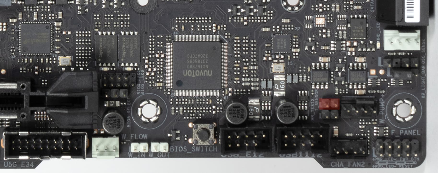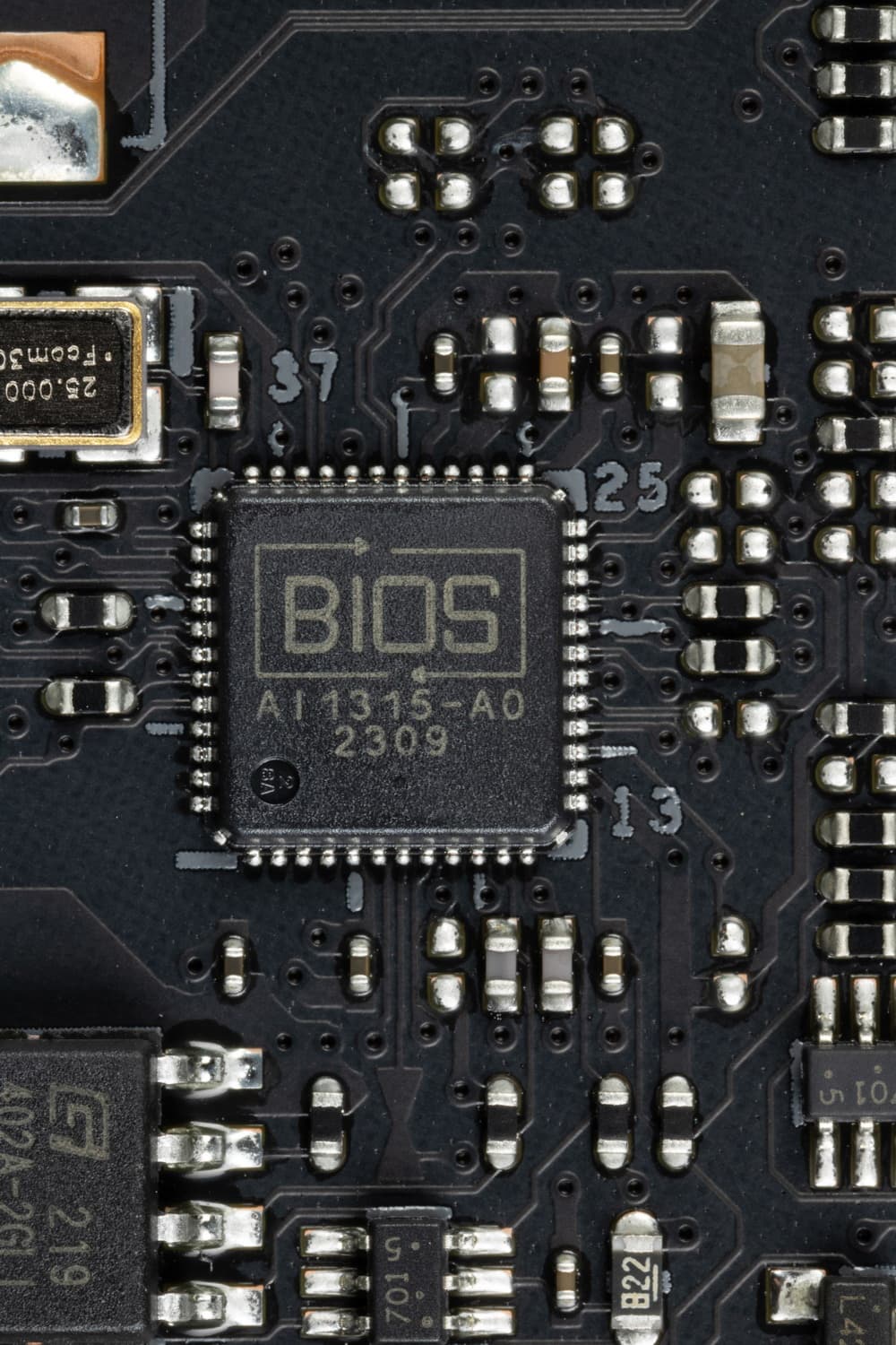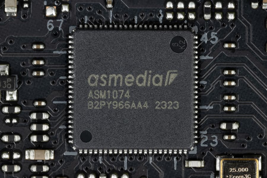 - 8 портов USB 3.2 Gen1: 4 реализованы через два контроллера ASMedia ASM3142 (на каждый из них потрачена 1 линия PCIe 3.0 от Z790) и представлены 2 внутренними разъемами на материнской плате (каждый на 2 порта); еще 4 реализованы через контроллер ASMedia ASM1074 (на него потрачена 1 линия USB 3.2 Gen2 от Z790) и представлены на задней панели портами Type-A (синего цвета);
