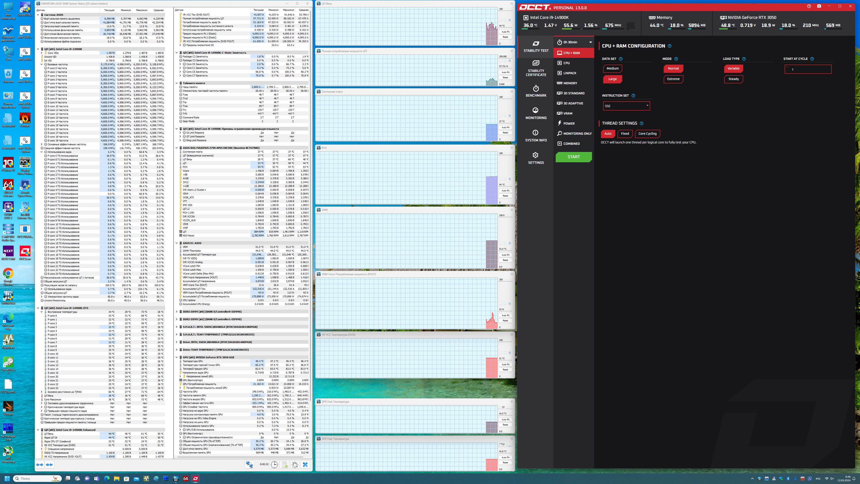 И вот как выглядела картина перед запуском стресс-теста. Да, мы можем видеть 6.0 ГГц на каких-то P-ядрах процессора. Такая частота не постоянна, плавает, но при этом присутствует в случае легких задач (не стресс-тестов, разумеется). Частоту работы памяти режим AI вернул по умолчанию, отключив XMP. Стоило лишь запустить стресс-тест, как картина полностью вернулась к первоначальной (5,7/4,4 ГГц). Таким образом, мы видим, что пока заложенный в UEFI некоторый «умный» режим как-то еще себя показывает исключительно на легких задачах, когда процессор не загружается выше 60-70%.