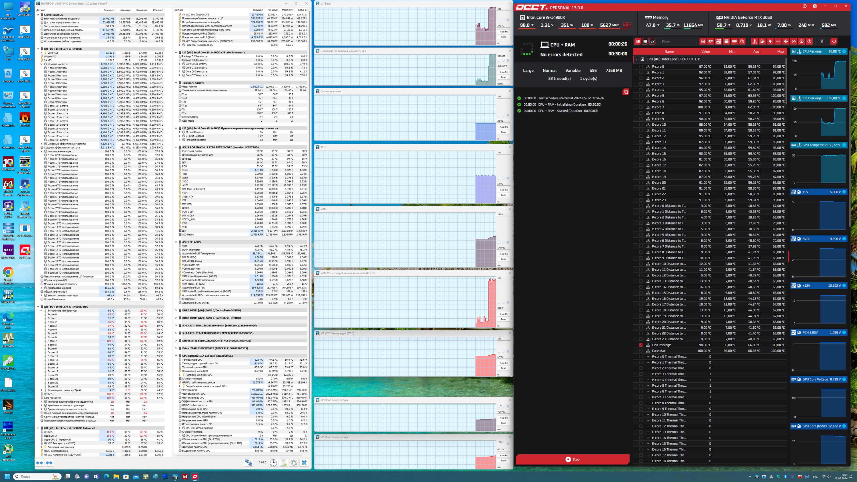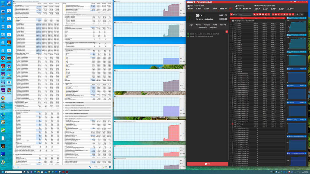 Уже по традиции на материнке с мощной системой питания в режиме авторазгона мы получили 5,7 ГГц по всем P-ядрам, и 4,4 ГГц по всем Е-ядрам! Напомню, что Р-ядра — это обычные всем привычные ядра, имеющие по 2 потока каждый, «Р» — означает Performance, то есть производительные. «Е» — это энергоэффективные ядра, так называемые, малые ядра, у них по 1 потоку. Все остальные параметры системы по нагреву компонентов были в норме. И стоит отметить, что потребление CPU уже перевалило за 300 Вт. Стоит отметить, что в данном случае память работала на штатных частотах из SPD (XMP отключен).