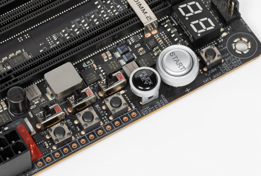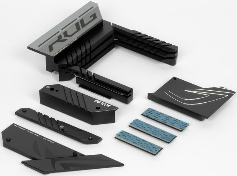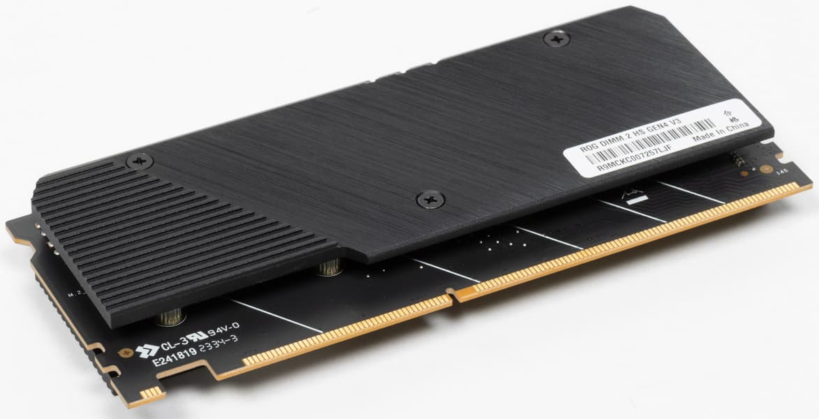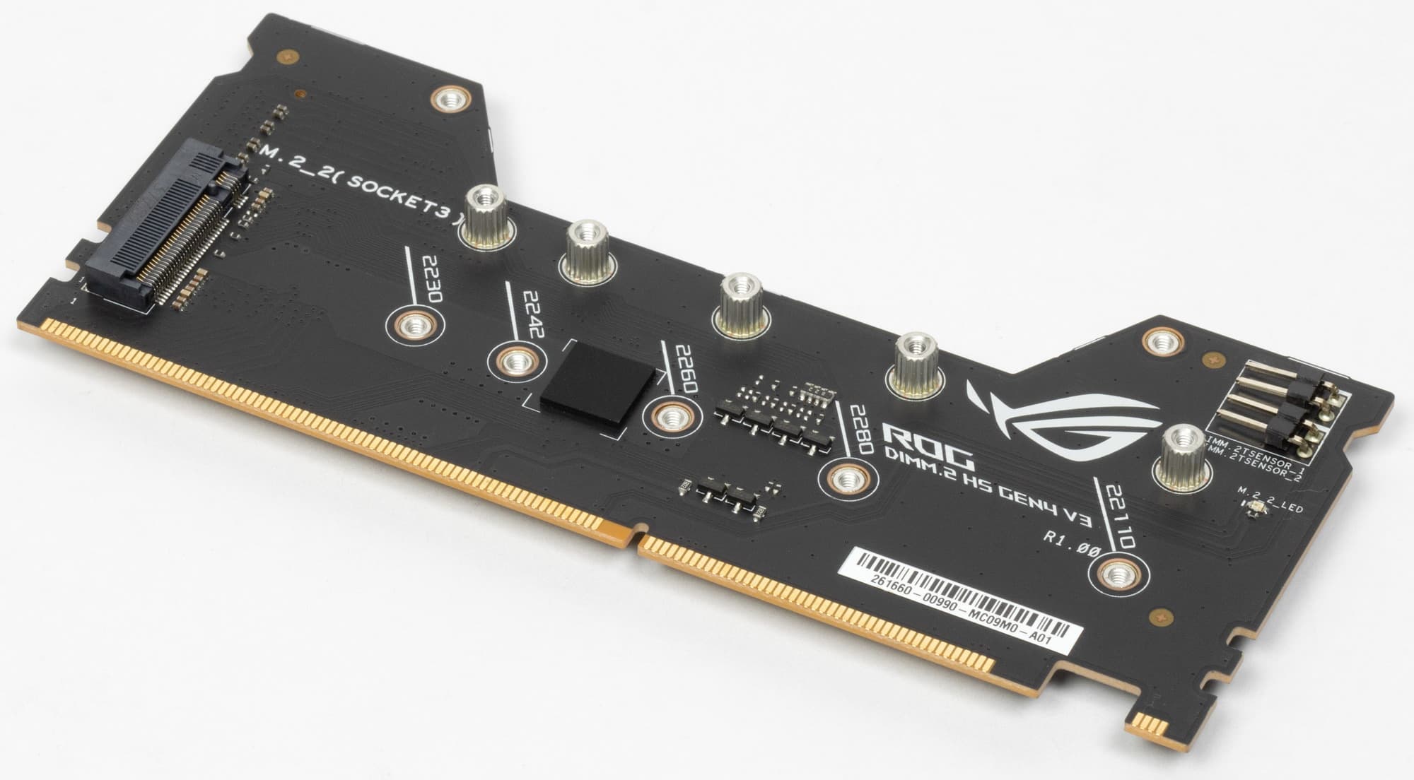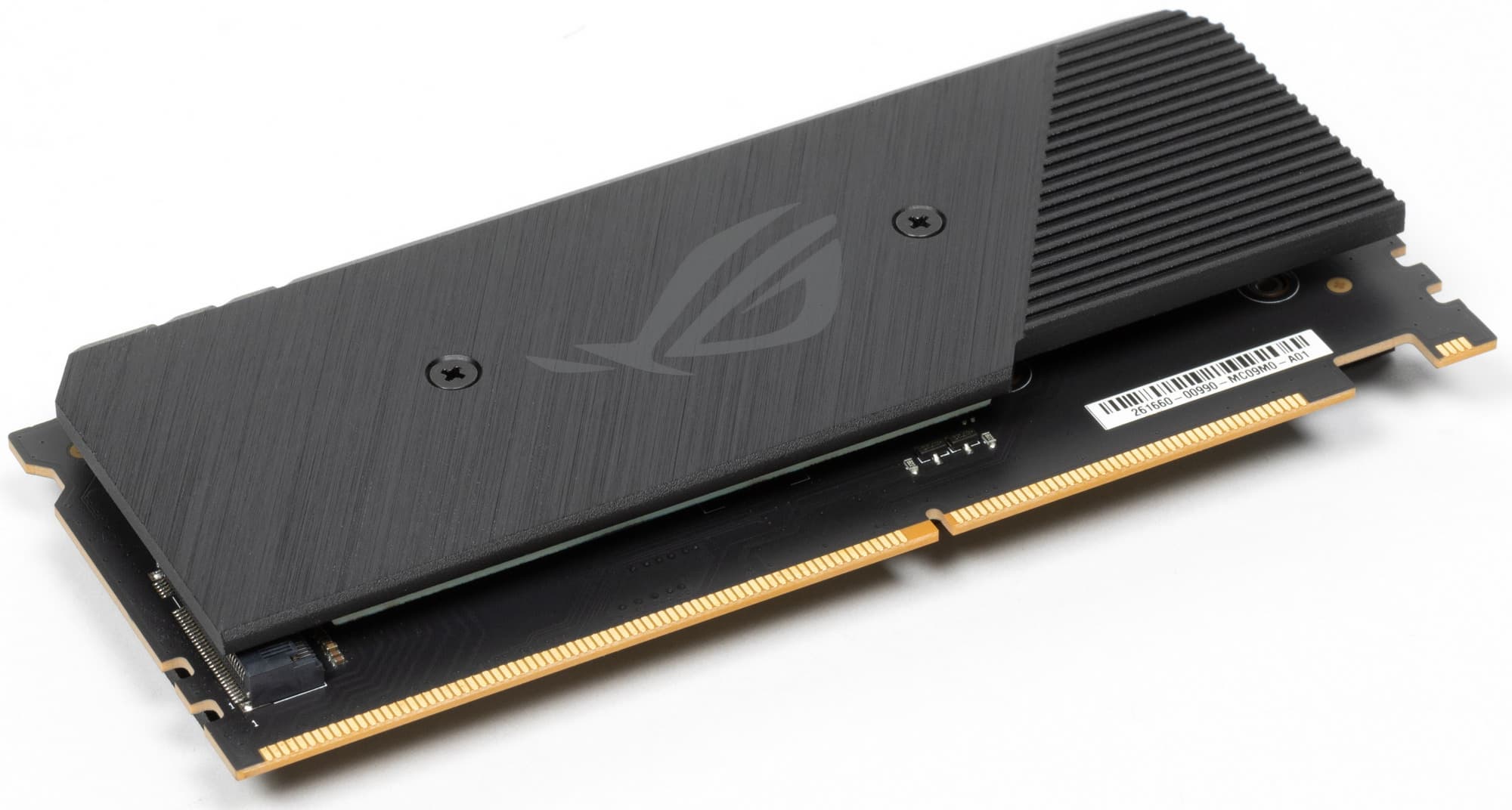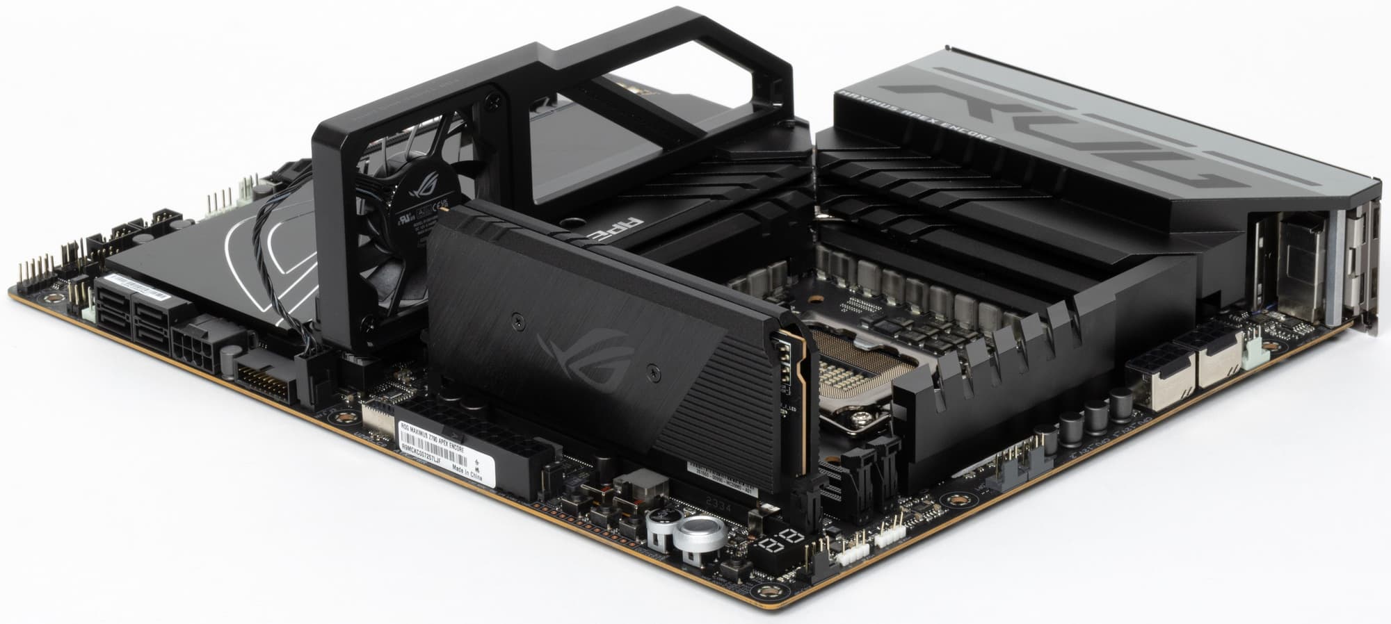 Все M.2 слоты имеют радиаторы. Верхний M.2_1 обладает усиленным радиатором, когда как остальные слоты M.2 на плате имеют более простые радиаторы. Слоты DIMM.2_1/2 имеют свои радиаторы, входящие в комплект с модулем ROG DIMM.2.