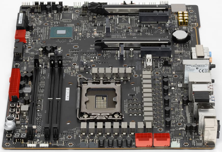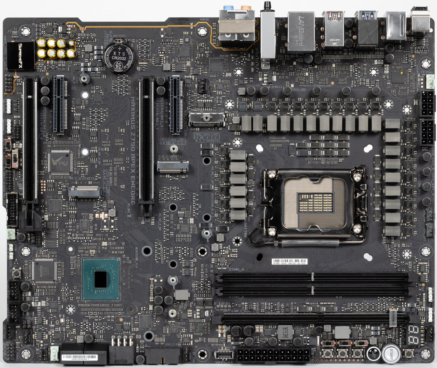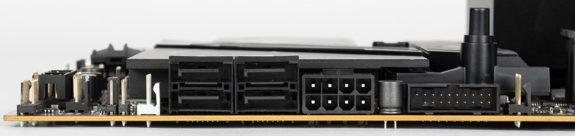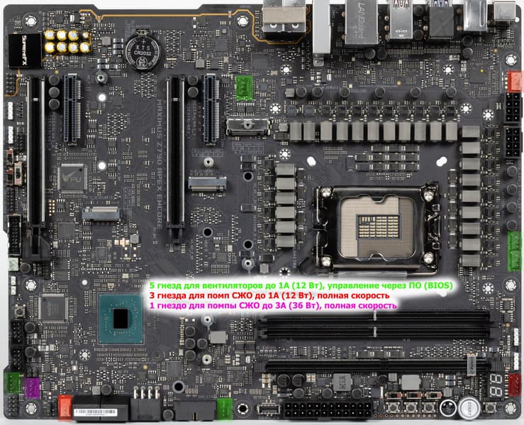 Для питания платы на ней предусмотрены 4 разъема: в дополнение к 24-контактному ATX (он на правой стороне платы (на фото — слева) здесь есть еще два 8-контактных EPS12V и один 8-контактный PCIe (для поддержки питания USB 3.2 Gen2x2 порта, через который могут заряжаться мобильные устройства в режиме быстрой зарядки до 60 Вт).