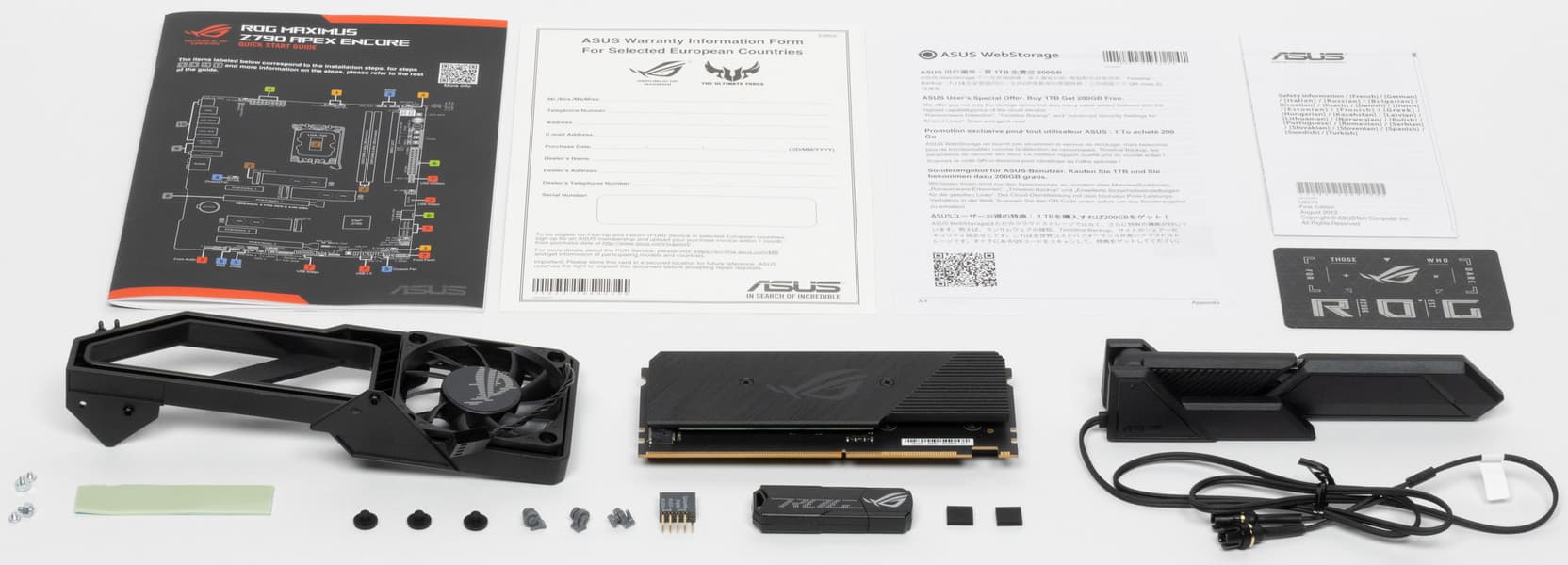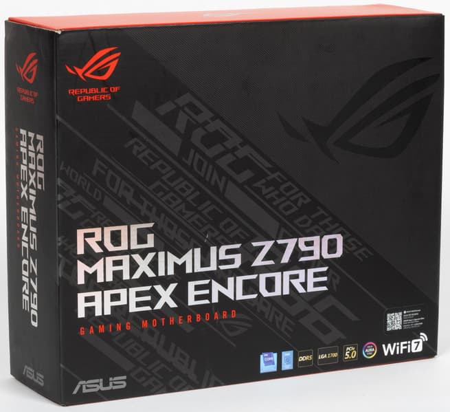 Asus ROG Maximus Z790 Apex Encore поставляется в традиционной толстой коробке фирменного дизайна серии ROG. Комплект размещен под платой в отдельном отсеке.