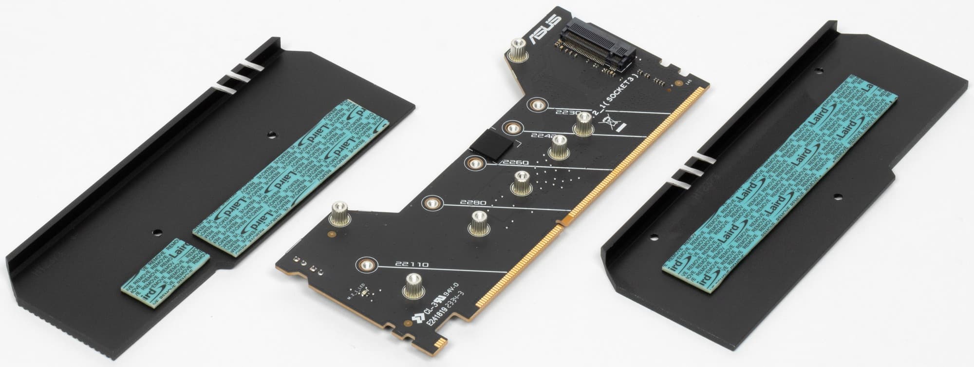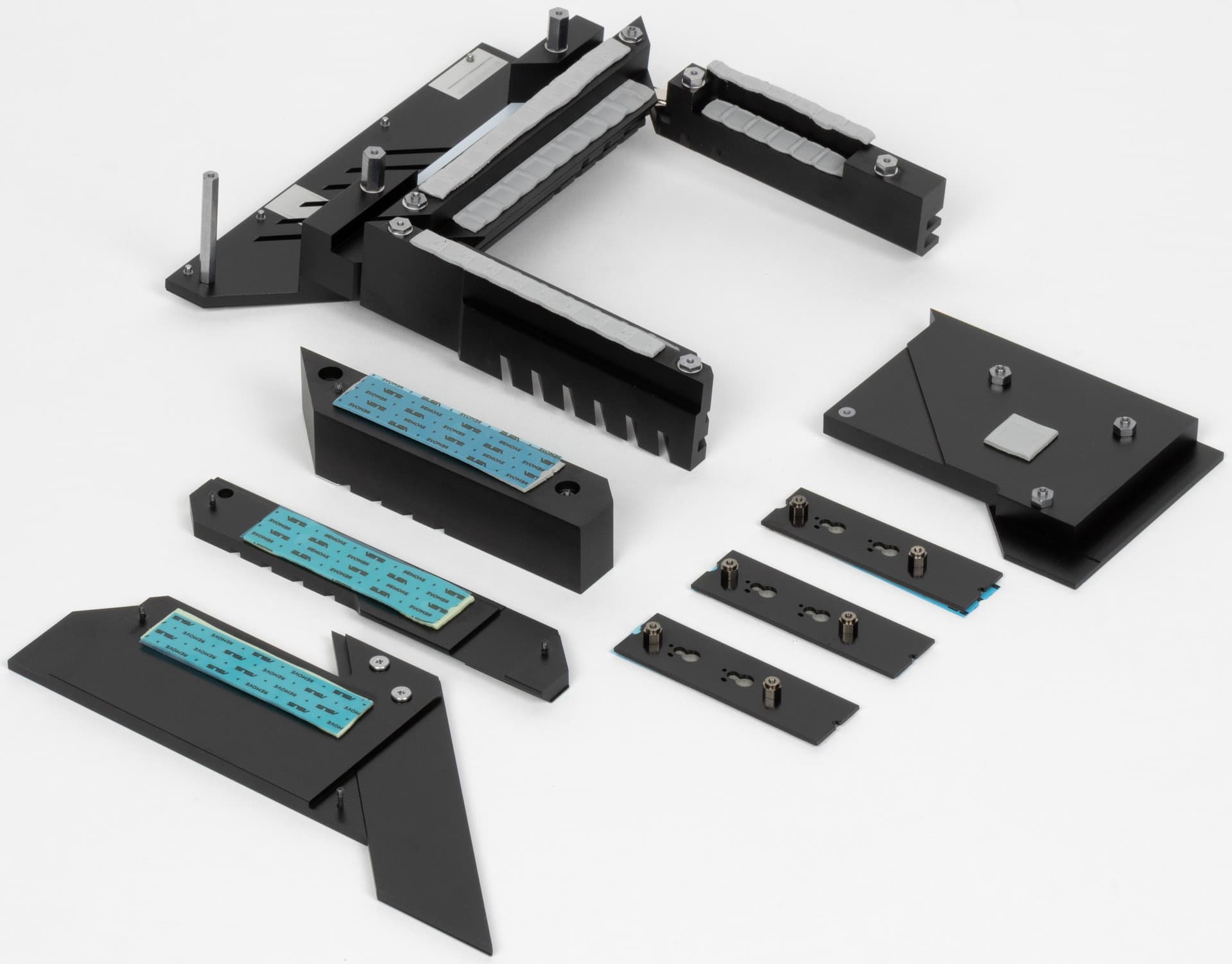 Как я уже упоминал ранее, все M.2 слоты также имеют собственные радиаторы. Три M.2 слота, размещенные на самой печатной плате, кроме верхних радиаторов еще имеют тонкие радиаторы и термопрокладки для охлаждения оборотных сторон модулей.