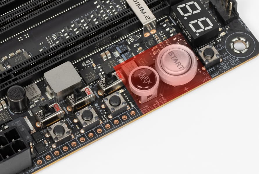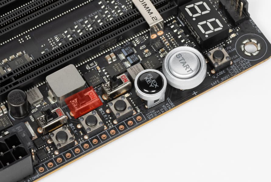 Остальные три слота M.2 получают данные от чипсета Z790. При этом слот M.2_3 также размещен на самой печатной плате, а вот остальные два – на фирменном модуле ROG DIMM.2, который вмещает в себя два посадочных места под накопители M.2. DIMM.2 устанавливается в особый слот (он имеет особый замок, не позволяющий перепутать слоты), расположенный рядом со слотами под модули памяти.
