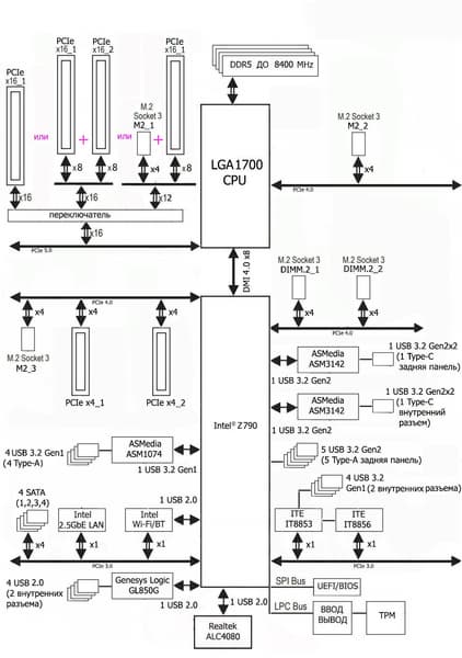 Процессоры Intel Core 14/13/12-го поколений (совместимые с сокетом LGA1700 и поддерживаемые Z790) имеют 20 линий ввода-вывода (16 PCIe 5.0, 4 PCIe 4.0), не имеют USB и SATA портов. При этом взаимодействие с Z790 идет по особому каналу Digital Media Interface 4.0 (DMI 4.0 x8). Все PCIe линии процессора идут на слоты расширения PCIe и порт М.2. Serial Peripheral Interface (SPI) используется для взаимодействия с системой UEFI/BIOS, а шина Low Pin Count (LPC) — для связи с устройствами ввода/вывода, не требующими высокой пропускной способности (контроллерами вентиляторов, TPM, старой периферии).