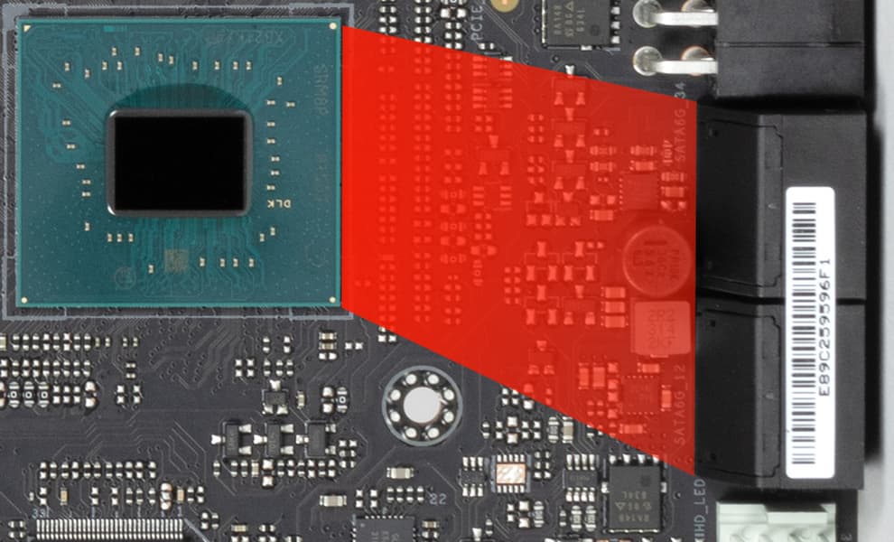 Два первых («процессорных») слота PCIe x16 имеют металлическое армирование из нержавеющей стали, которое увеличивает их надежность (что может быть важным в случае довольно частой смены видеокарт, но что более важно: такой слот легче выдержит нагрузку на изгиб в случае установки очень тяжелой видеокарты топового уровня. Кроме того, такая защита предохраняет слоты от электромагнитных помех.