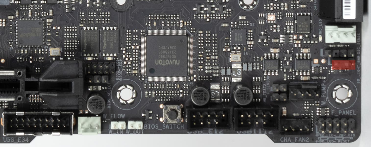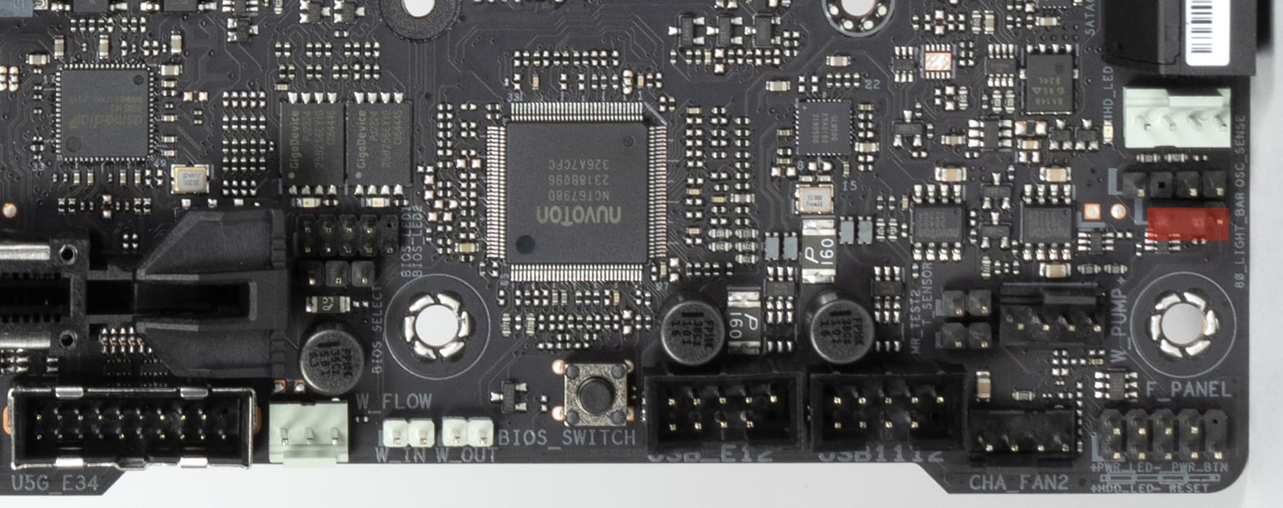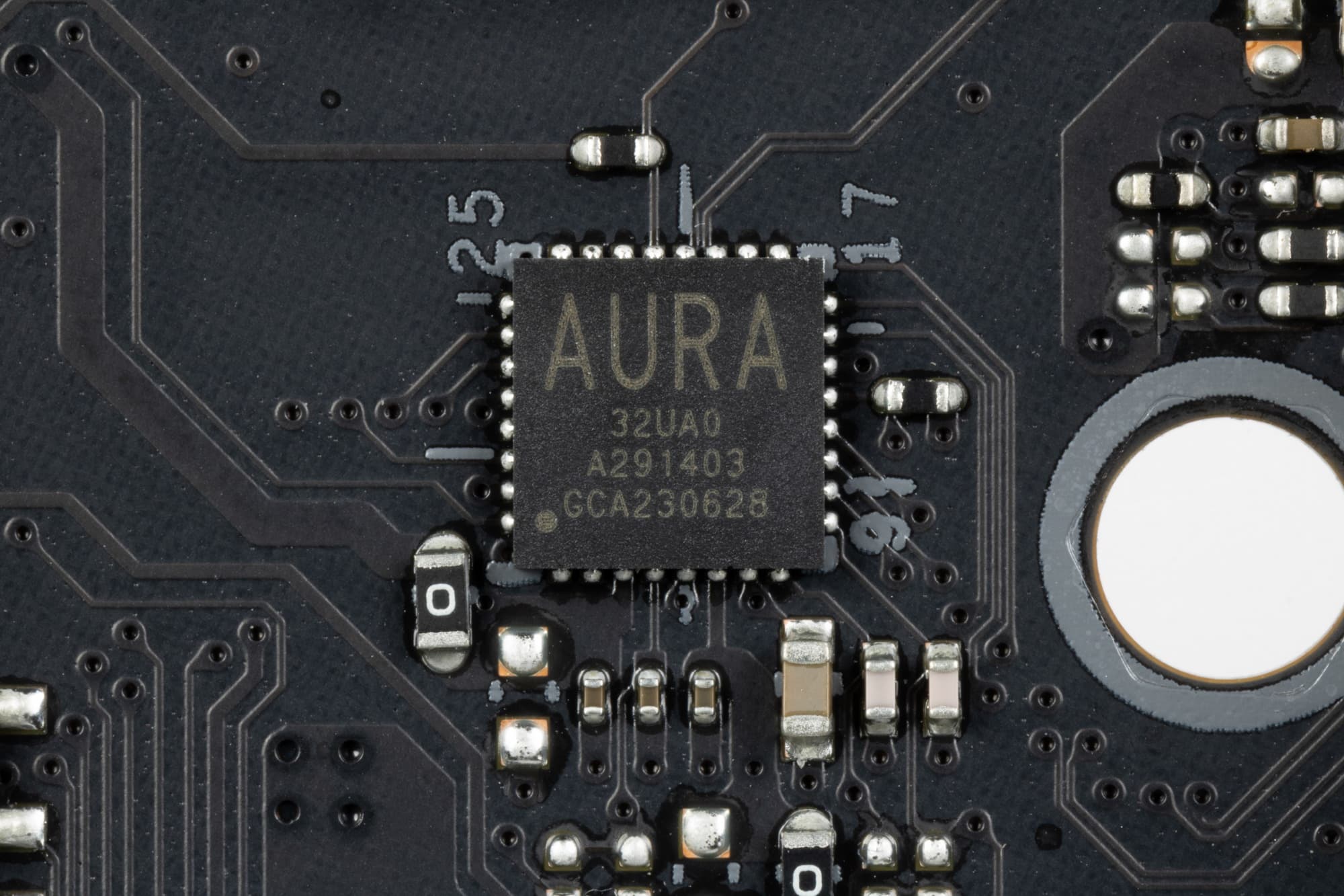 Радиатор VRM, идущий вдоль заднего блока портов, имеет рассеиватель светодиодов подсветки, которые установлены на самой PCB позади блока с преобразователями питания.