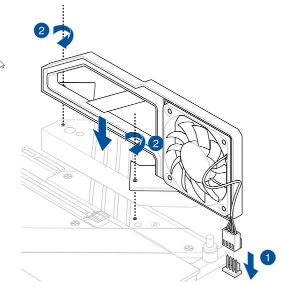 Напомню, что кроме встроенных средств охлаждения данная плата имеет в комплекте поставки дополнительный вентилятор с креплением для обдува модулей памяти. Схема установки данного устройства приведена выше.