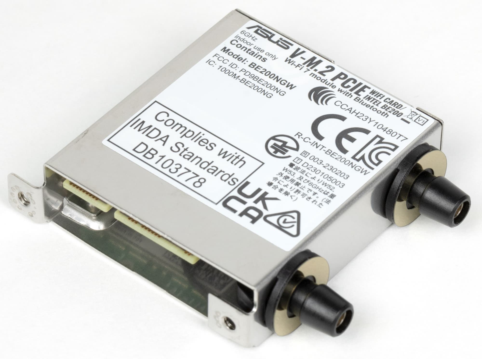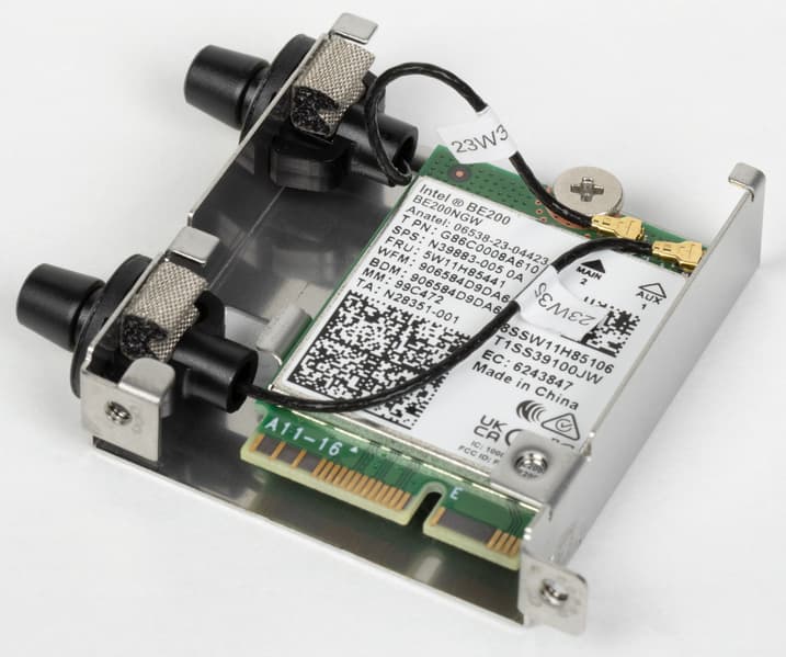 Имеется и самый современный комплексный беспроводной адаптер на контроллере Intel BE200NGW, через который реализованы Wi-Fi 7 (802.11a/b/g/n/ac/ax/be) и Bluetooth 5.4. Он установлен в слот M.2 (E-key), и его разъемы для подключения выносных антенн выведены на заднюю панель.