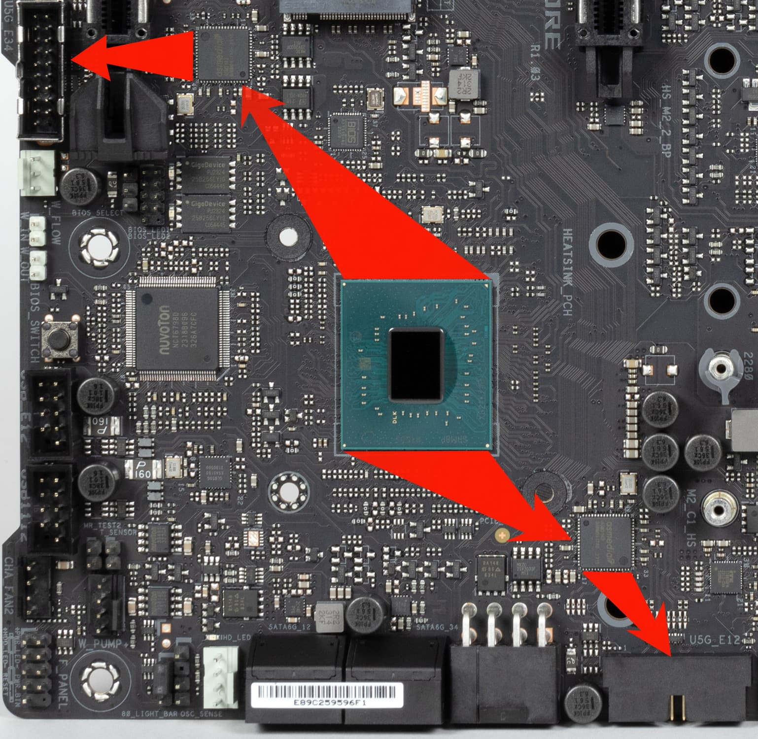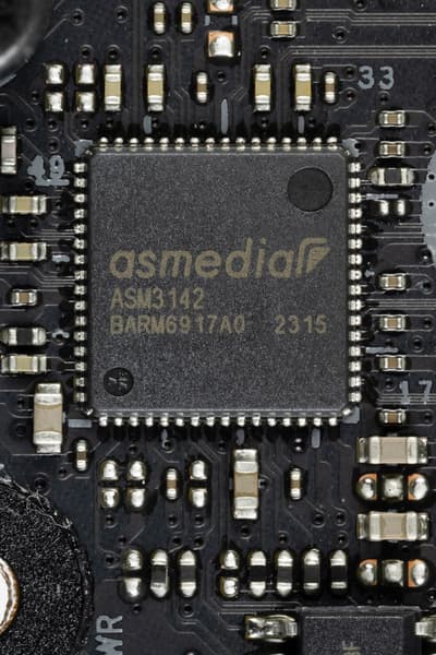 - Два ASMedia ASM3142 (4 USB 3.2 Gen1 через 2 внутренних разъема) (2 линии PCIe 3.0);