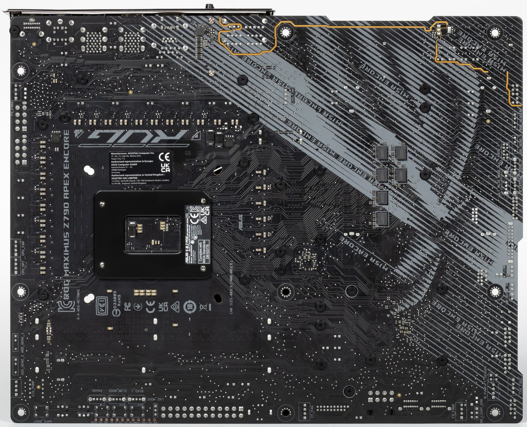 Форм-фактор ATX имеет размеры до 305×244 мм, а E-ATX — до 305×330 мм. Материнская плата Asus ROG Maximus Z790 Apex Encore имеет размеры 305×244 мм, поэтому выполнена в форм-факторе ATX, и на ней имеются 9 монтажных отверстий для установки в корпус.