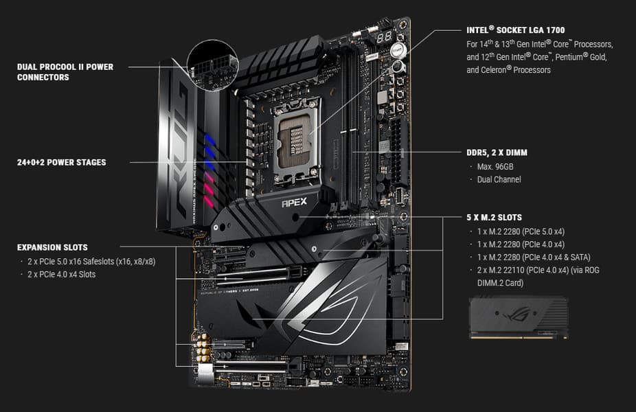 Asus ROG Maximus Z790 Apex Encore поддерживает процессоры Intel Core 12/13/14-го поколений, выполненные под разъем (сокет) LGA1700.