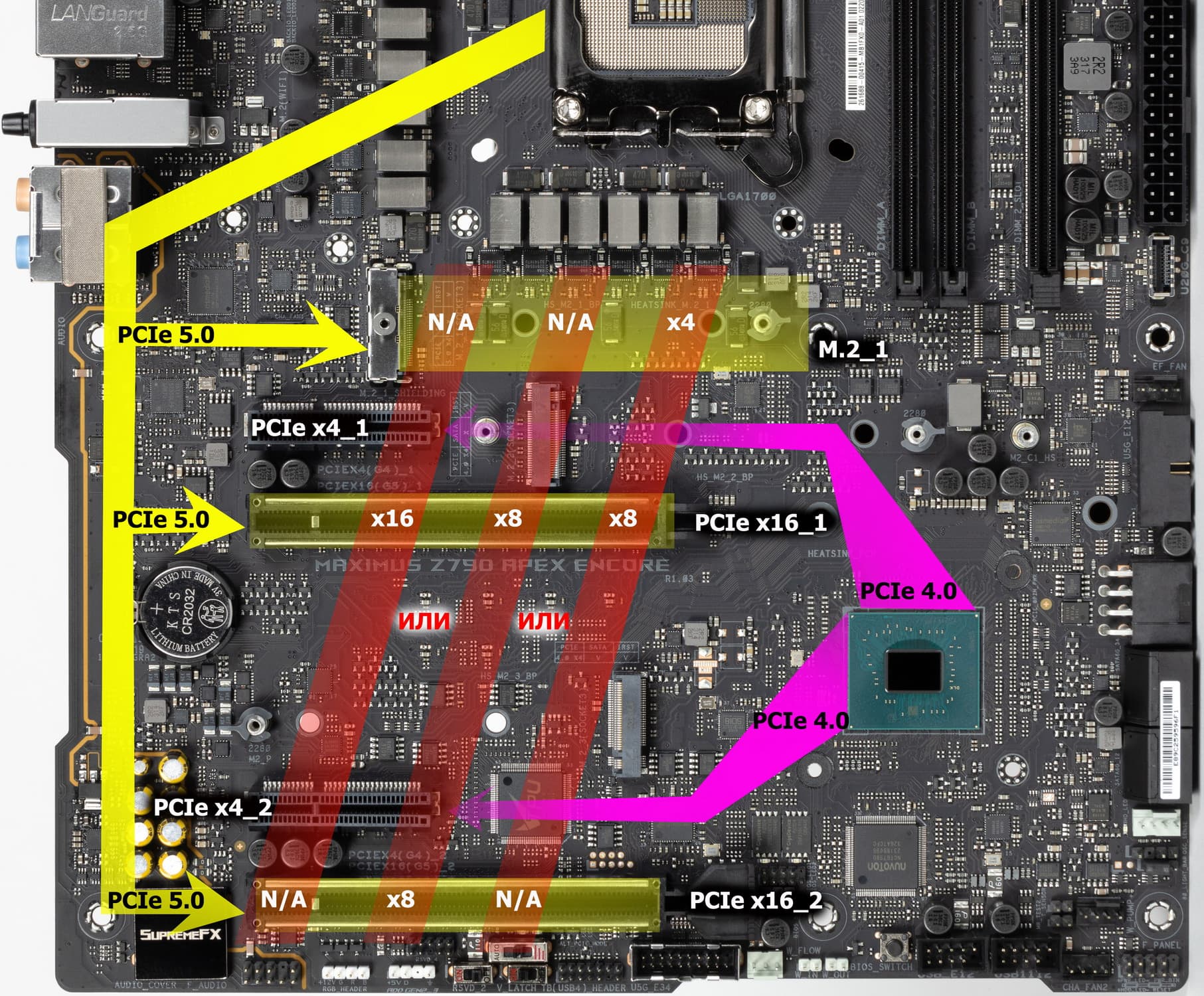 Теперь посмотрим выше на то, как работают процессоры в данной конфигурации. У CPU 14/13/12-го поколений всего 20 линий PCIe, 4 из них версии PCIe 4.0 отведены на слот М.2 (M2_2). Оставшиеся 16 линий PCIe 5.0 надо делить на два слота PCIe x16 (_1 и _2) и слот M.2_1. Вариантов переключения несколько: