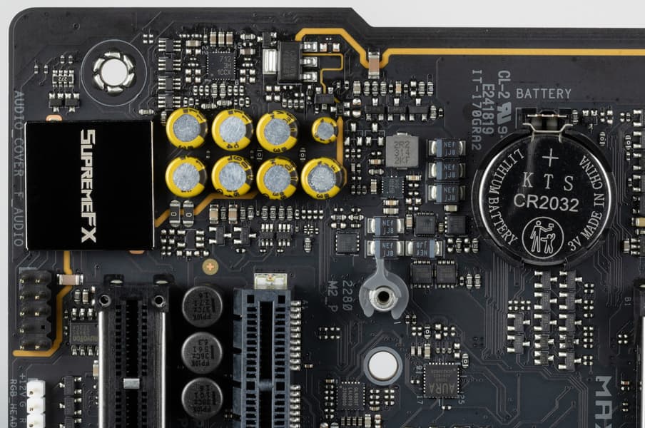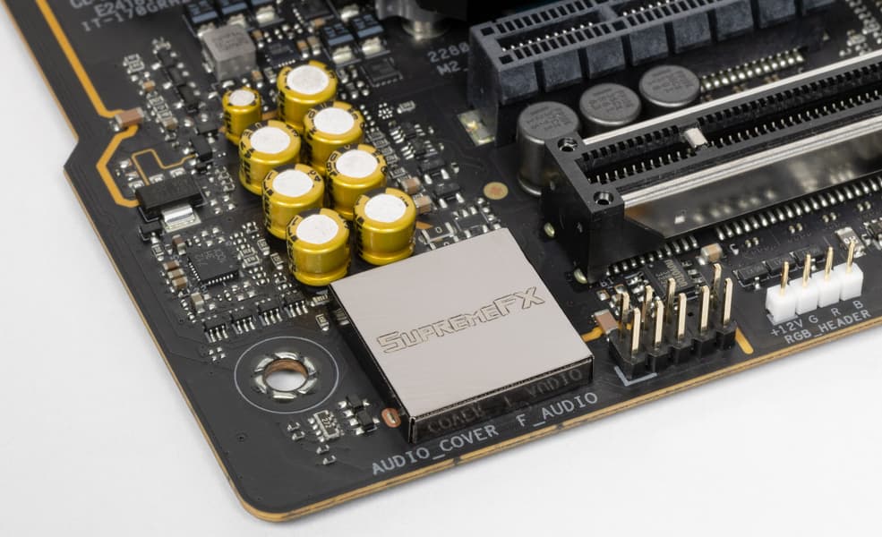 Мы знаем, что ранее самым популярным в большинстве современных материнских платах звуковым кодеком был Realtek ALC1220, обеспечивающий вывод звука по схемам до 7.1 с разрешением до 24 бит / 192 кГц . Ныне на матплатах топового уровня встречается уже ALC4080 того же производителя с улучшенными характеристиками 32 бит / 384 кГц. В традициях Asus закрывать кодек металлическим колпачком с названием SupremeFX.