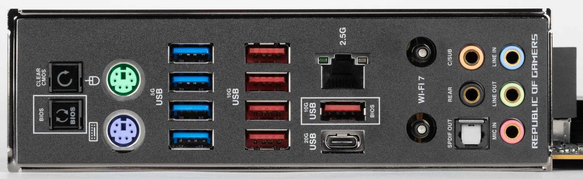 - 5 портов USB 3.2 Gen2: все реализованы через Z790 и представлены на задней панели портами Type-A (красного цвета);