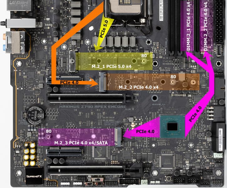 Кроме USB-портов, к которым мы подойдем позже, чипсет Z790 обладает 28 PCIe линиями. Считаем, сколько линий уходит на поддержку (связь) с тем или иным элементом (надо учитывать, что 28 линий не единой версии, а 20 линий PCIe 4.0 и 8 линий PCIe 3.0):