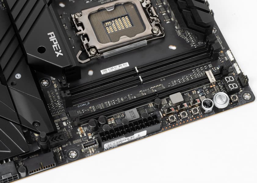 Материнская плата Asus ROG Maximus Z790 Apex Encore — представитель топовой серии ROG, почти флагманская модель для платформы Intel LGA1700 с примерной стоимостью в районе 80-90 тысяч рублей. Это очень навороченная плата с поддержкой 12/13/14-го поколений процессоров Intel Core, созданная для специально для энтузиастов-оверклокеров и хардкорных геймеров. В частности, здесь всего 2 слота для модулей памяти — потому что именно с парой модулей можно получить максимальный скоростной режим (да и вообще, при наличии на рынке модулей памяти с объемом до 64 ГБ проблема нехватки памяти для подавляющего большинства пользователей неактуальна).