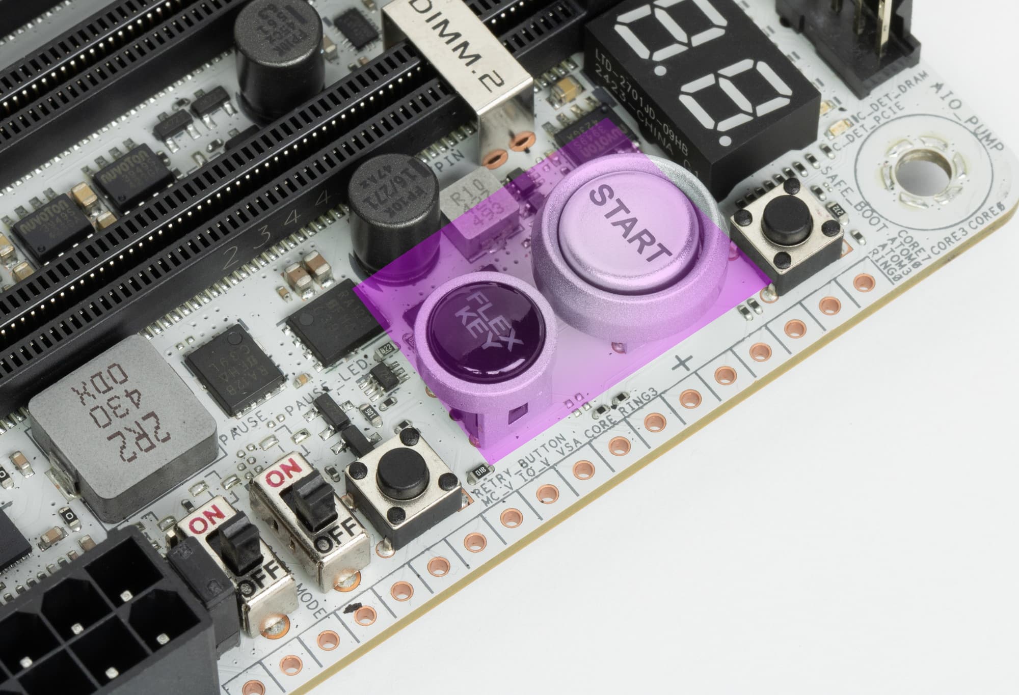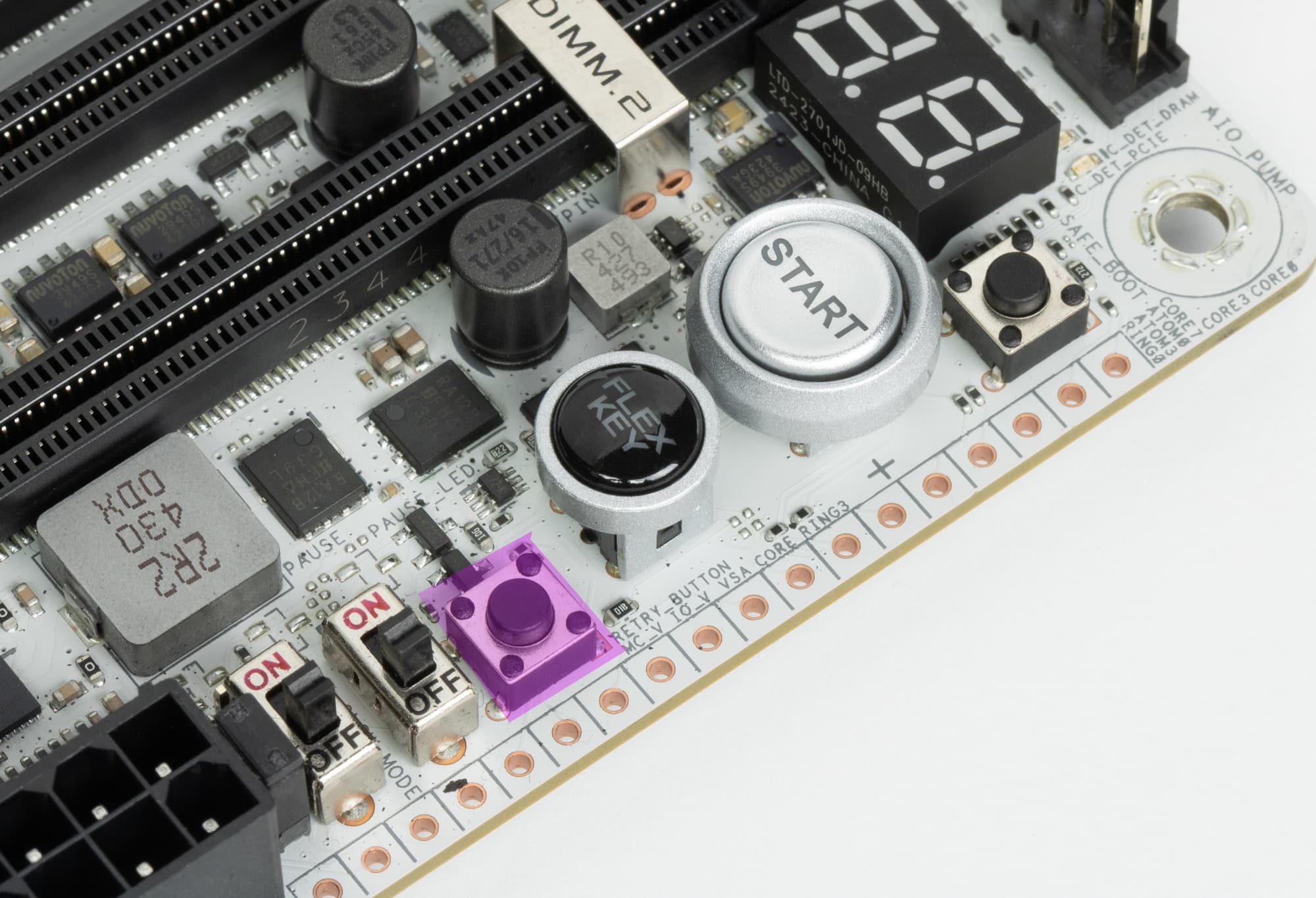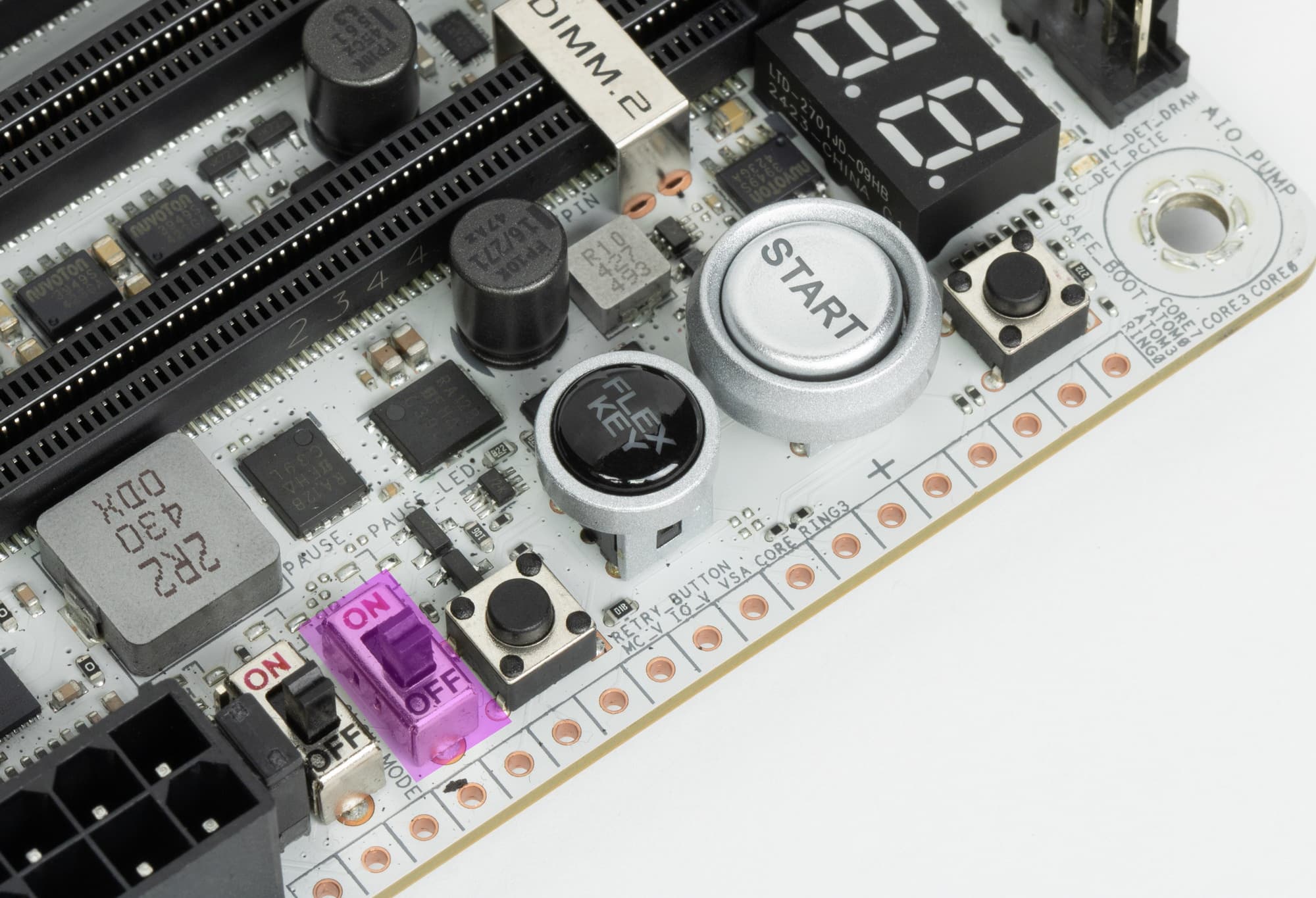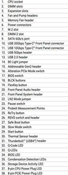 | Прочие внутренние элементы | 24-контактный разъем питания ATX 2 8-контактный разъем питания EPS12V 1 8-контактный разъем питания PCIe 1 слот M.2 (E-key), занят адаптером беспроводных сетей 1 разъем для подключения порта USB 3.2 Gen2x2 Type-C 1 разъем для подключения порта USB 3.2 Gen2 Type-C 2 разъема для подключения 4 портов USB 3.2 Gen1 2 разъема для подключения 4 портов USB 2.0 8 разъемов для подключения 4-контактных вентиляторов и помп ЖСО 3 разъема для подключения адресуемой ARGB-ленты 1 разъем аудио для передней панели корпуса 1 переключатель версии PCIe Alt_PCI_mode 1 разъем для термодатчиков 2 переключателя Pause и Slow Mode при разгоне 6 кнопок для повышения/понижения частот шин, Safe Boot и Retry при разгоне 1 переключатель версий BIOS 1 разъем для подключения управления с передней панели корпуса 2 кнопки: питание Power и конфигурируемая кнопка перезагрузки FlexKey 1 разъем для подключения дискретных карт Thunderbolt4 |