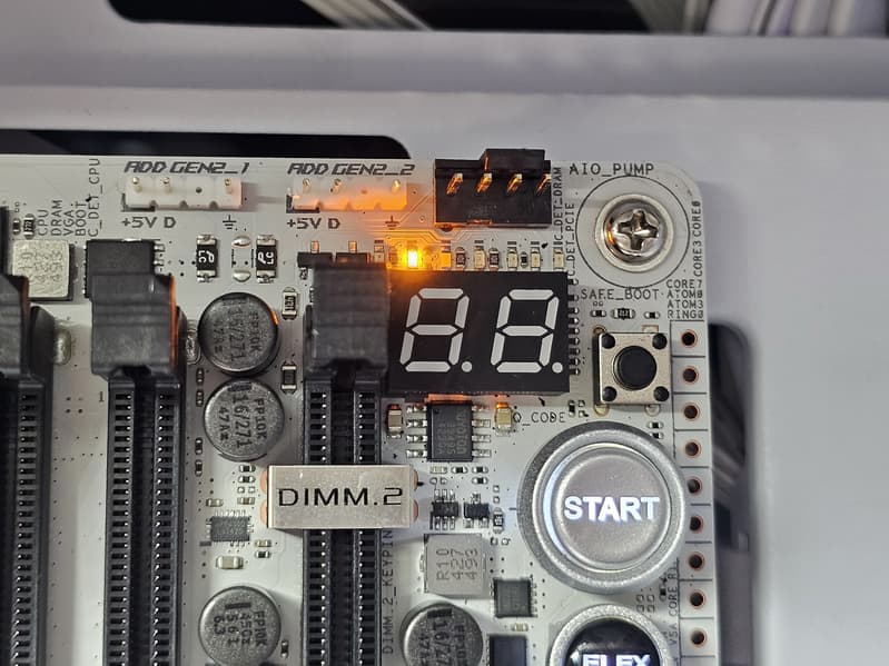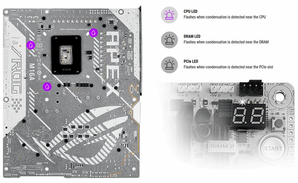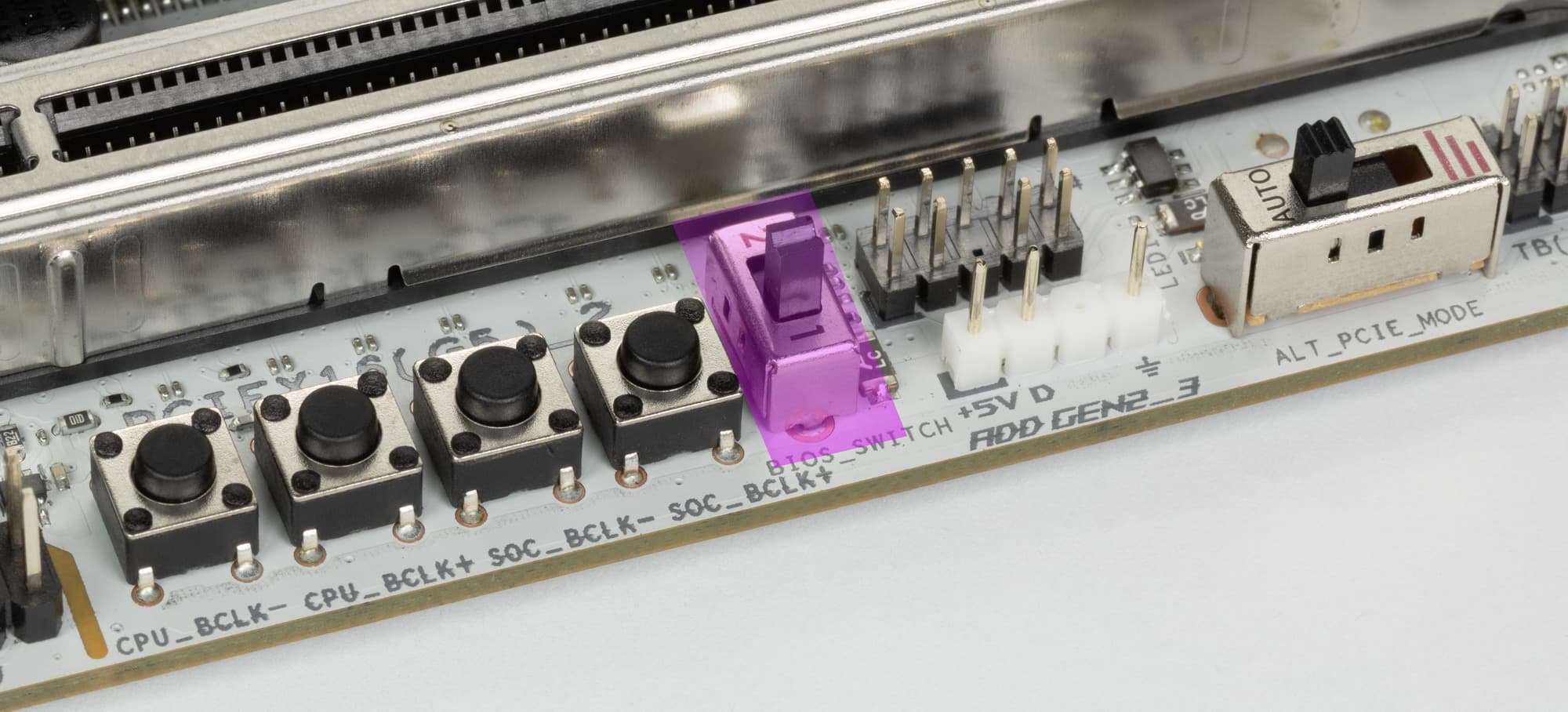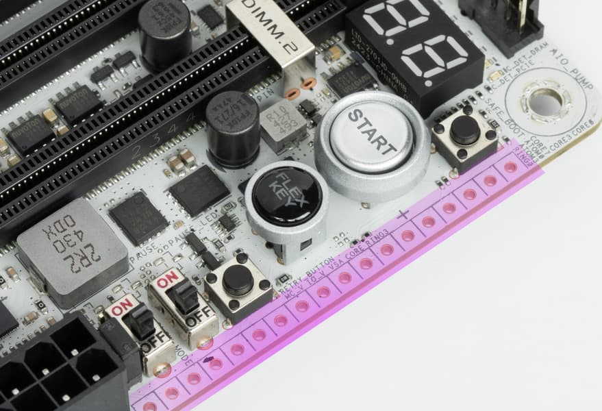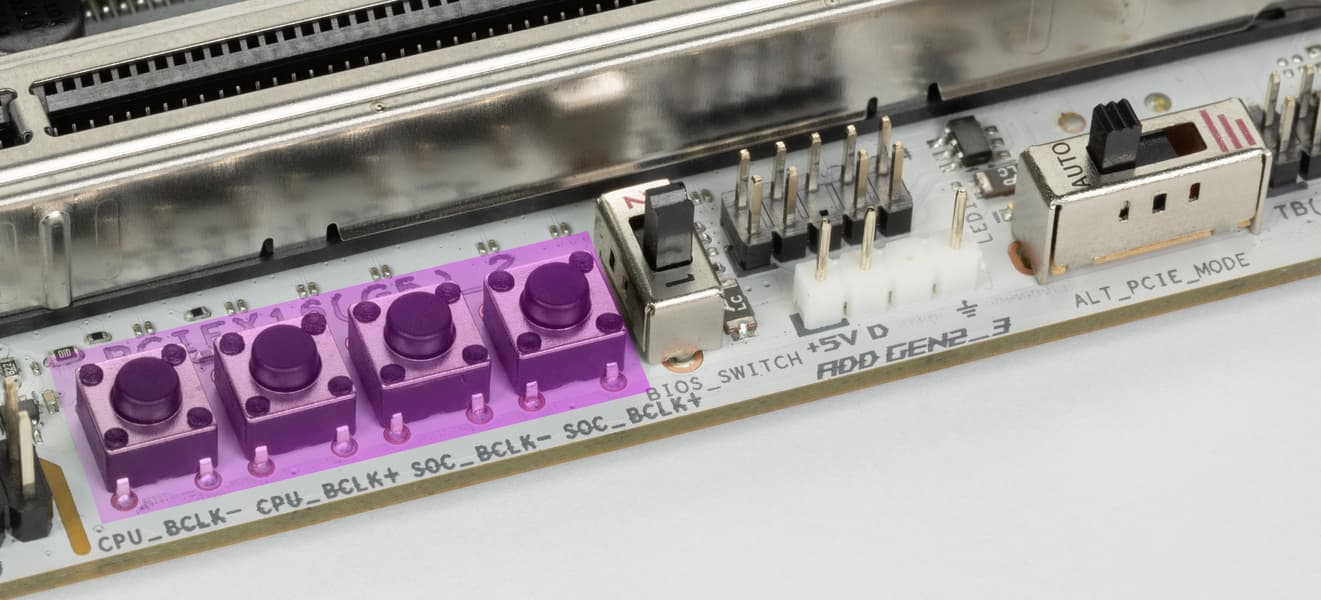 | Прочие внутренние элементы | 24-контактный разъем питания ATX 2 8-контактный разъем питания EPS12V 1 8-контактный разъем питания PCIe 1 слот M.2 (E-key), занят адаптером беспроводных сетей 1 разъем для подключения порта USB 3.2 Gen2x2 Type-C 1 разъем для подключения порта USB 3.2 Gen2 Type-C 2 разъема для подключения 4 портов USB 3.2 Gen1 2 разъема для подключения 4 портов USB 2.0 8 разъемов для подключения 4-контактных вентиляторов и помп ЖСО 3 разъема для подключения адресуемой ARGB-ленты 1 разъем аудио для передней панели корпуса 1 переключатель версии PCIe Alt_PCI_mode 1 разъем для термодатчиков 2 переключателя Pause и Slow Mode при разгоне 6 кнопок для повышения/понижения частот шин, Safe Boot и Retry при разгоне 1 переключатель версий BIOS 1 разъем для подключения управления с передней панели корпуса 2 кнопки: питание Power и конфигурируемая кнопка перезагрузки FlexKey 1 разъем для подключения дискретных карт Thunderbolt4 |