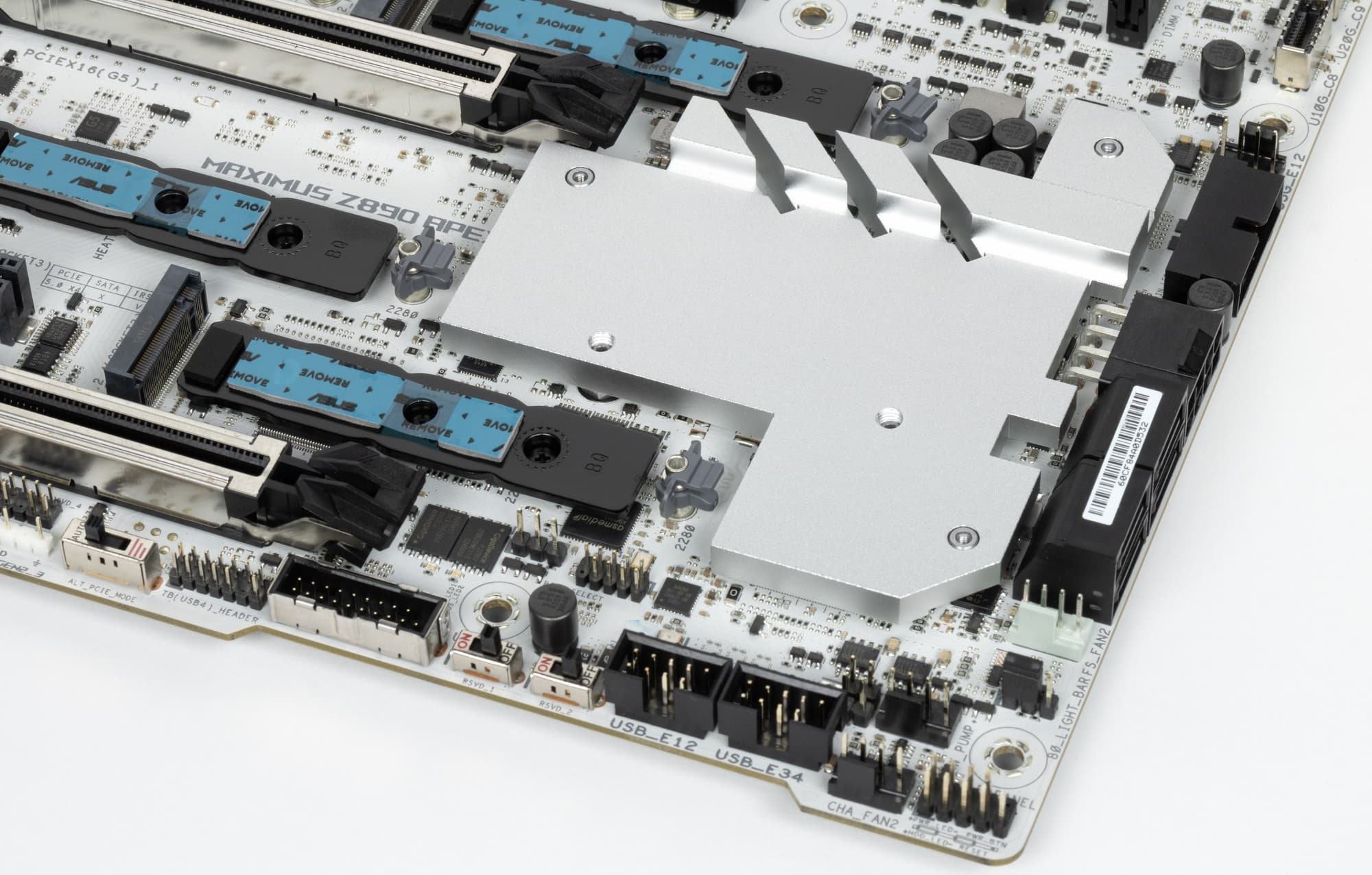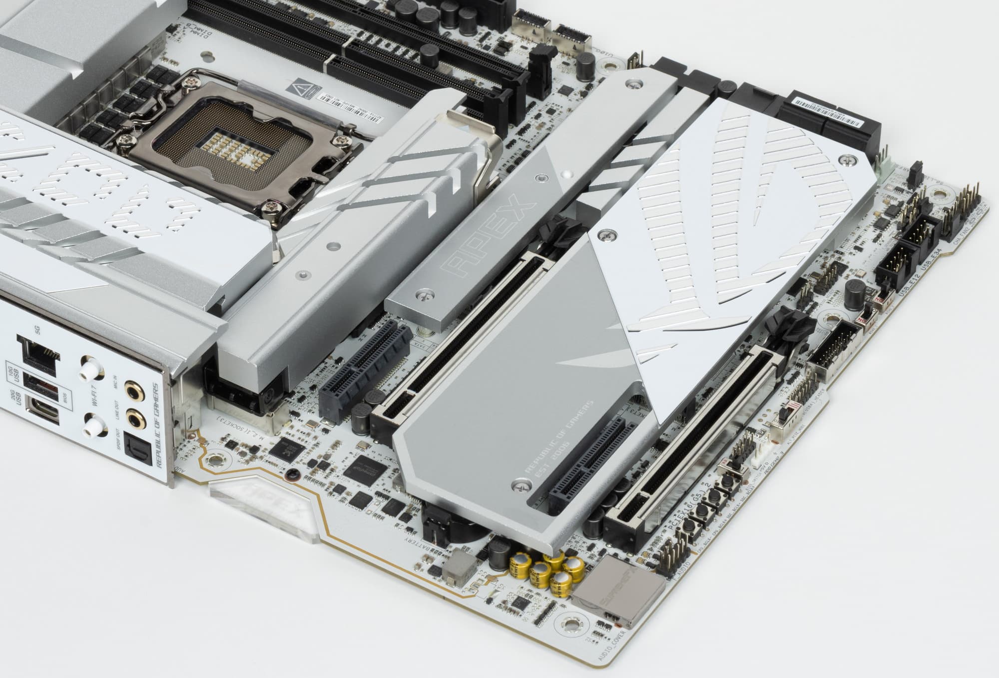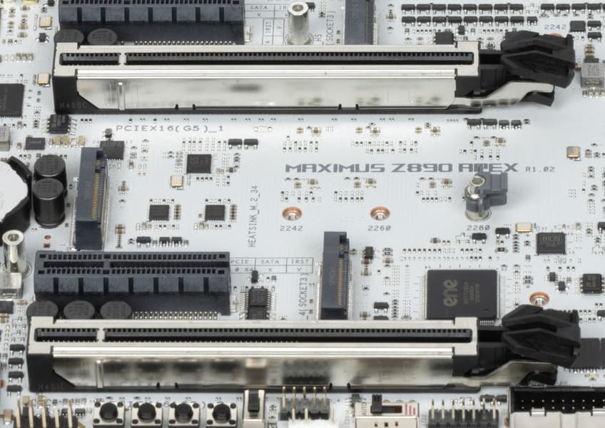 У Asus ROG Maximus Z890 Apex имеется 21 порт USB разных видов, включая 2 самых быстрых USB4, два USB 3.2 Gen2×2 в виде портов Type-C (на задней панели и внутреннего) и 9 USB 3.2 Gen2/1. Также плата предлагает 2 слота PCIe х16, которые получают от процессора 16 линий PCIe 5.0, деля эти линии как между собой, так и с двумя слотами M.2, и два слота PCIe 4.0 x4, подключенных к чипсету.