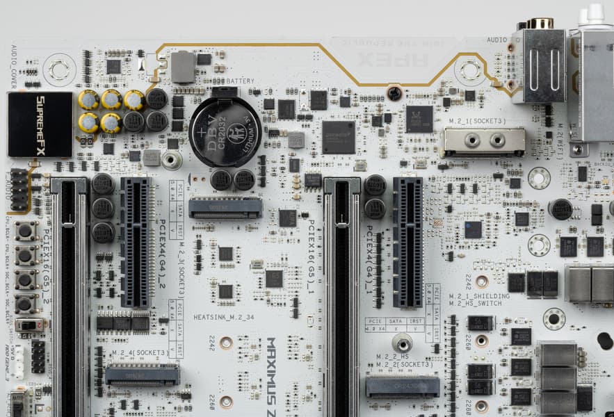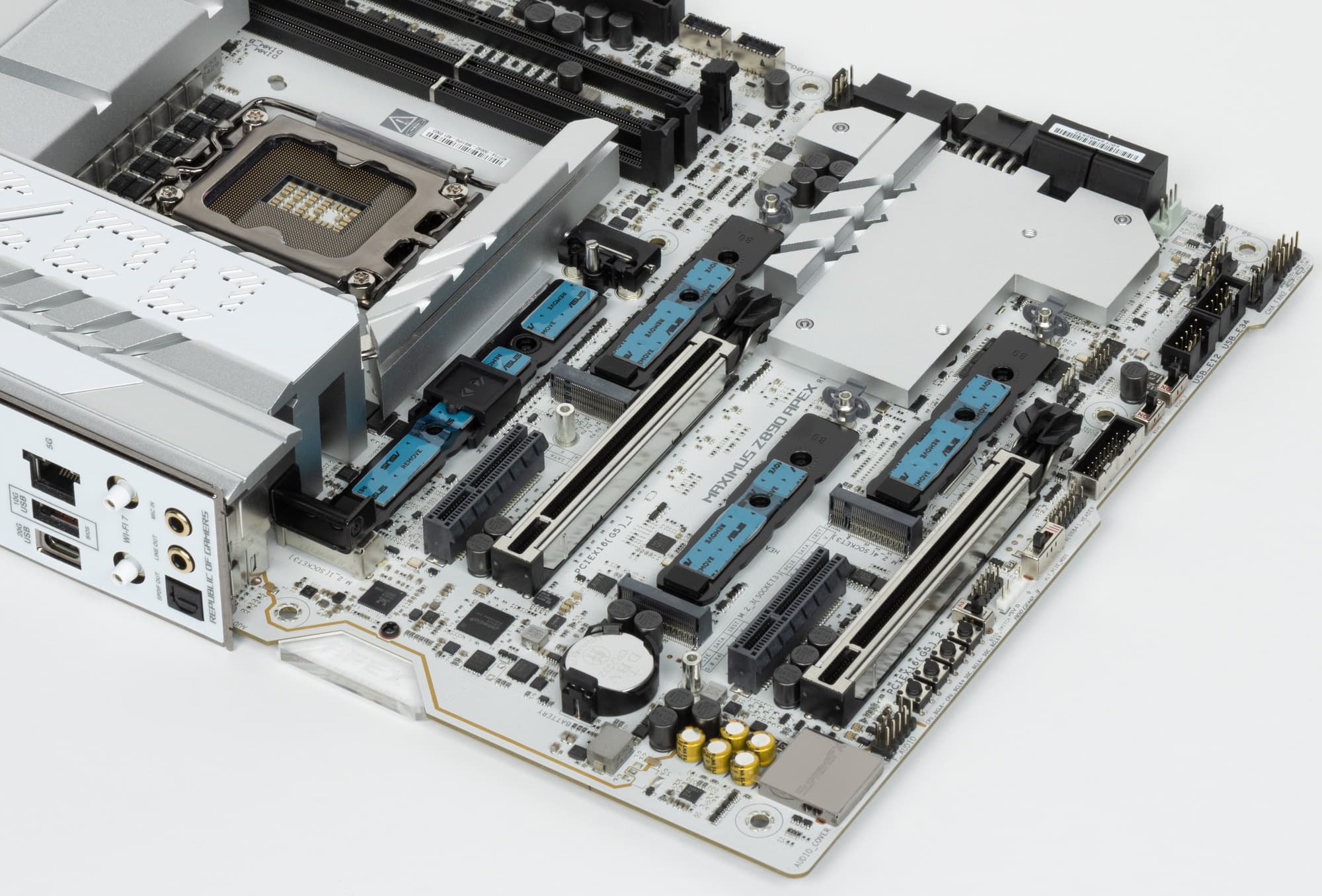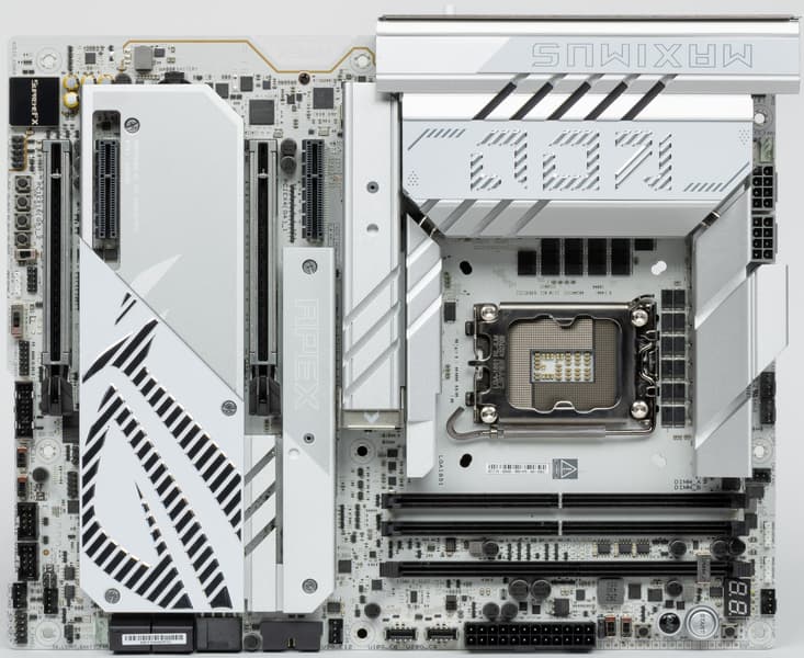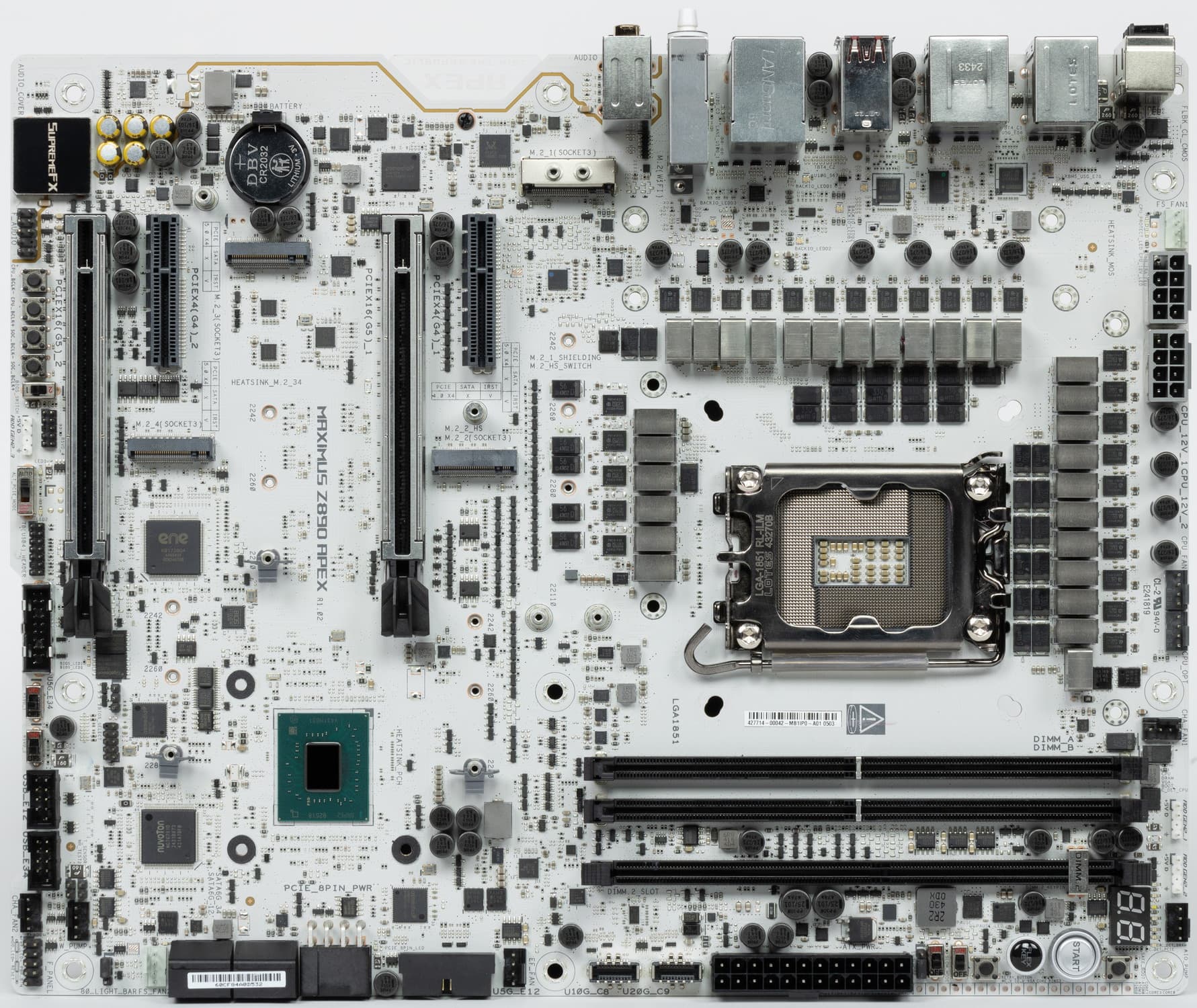 У Asus ROG Maximus Z890 Apex имеется 21 порт USB разных видов, включая 2 самых быстрых USB4, два USB 3.2 Gen2×2 в виде портов Type-C (на задней панели и внутреннего) и 9 USB 3.2 Gen2/1. Также плата предлагает 2 слота PCIe х16, которые получают от процессора 16 линий PCIe 5.0, деля эти линии как между собой, так и с двумя слотами M.2, и два слота PCIe 4.0 x4, подключенных к чипсету.