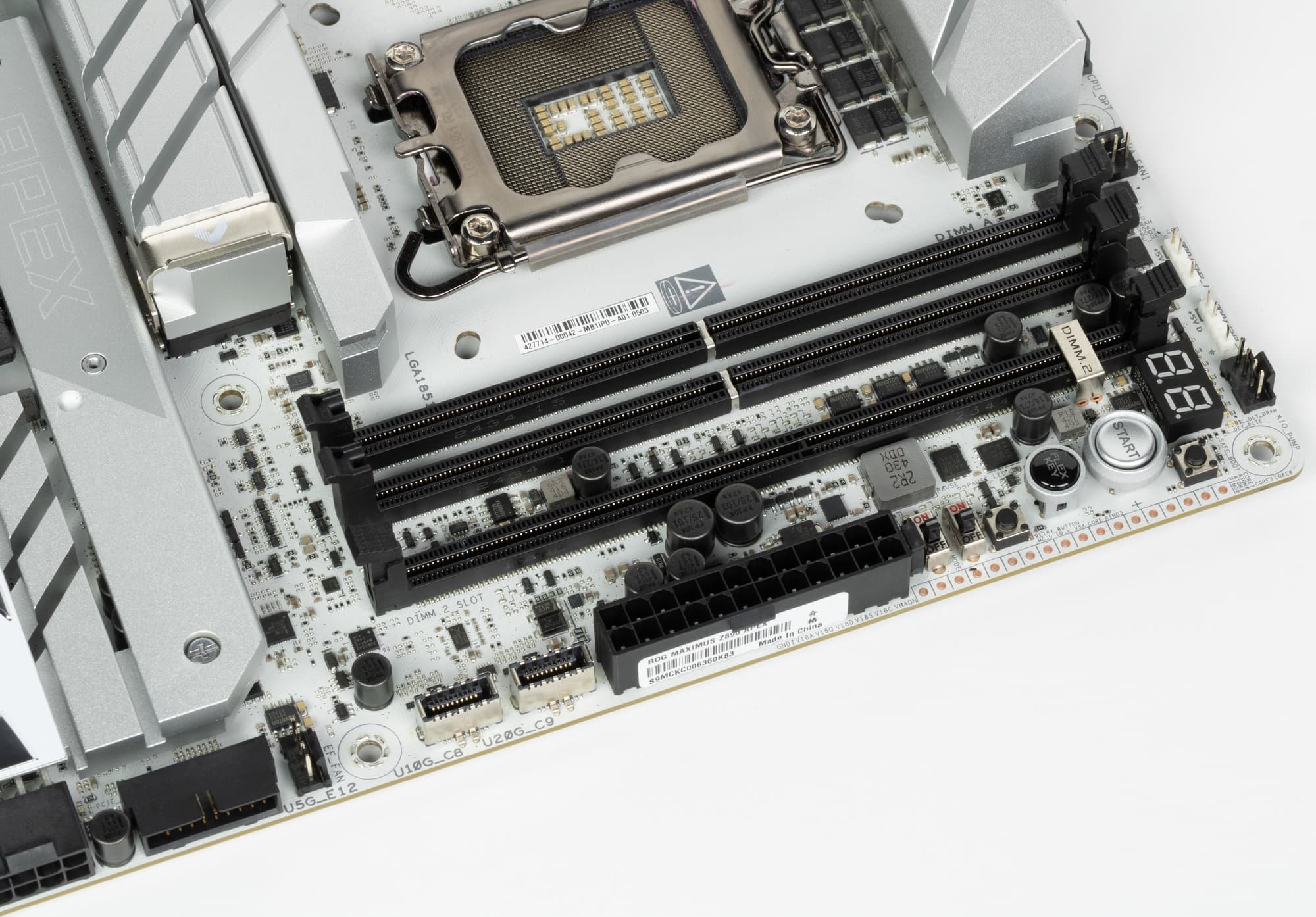 Плата поддерживает небуферизованную память DDR5 (non-EСС), а максимальный объем памяти составляет 128 ГБ. Могут использоваться модули CUDIMM.