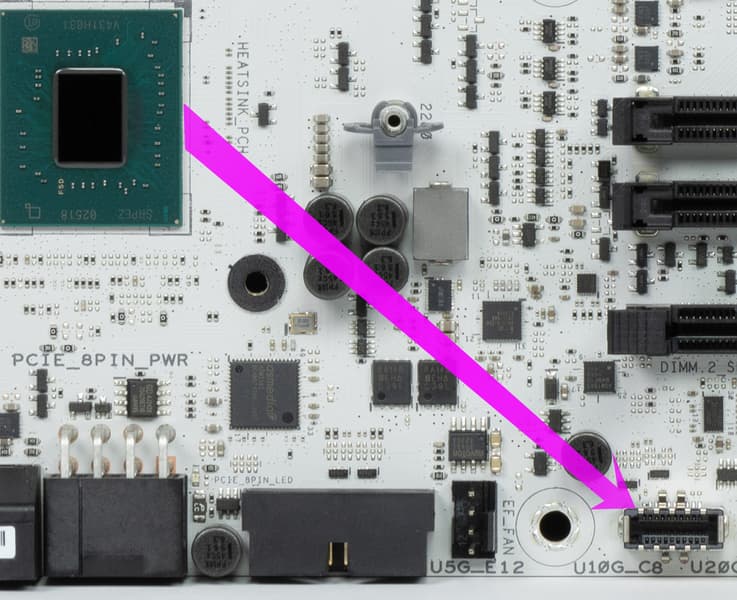Внутренний USB порт 3.2 Gen2x2 позволяет выдавать вольтаж, способный обеспечить быструю зарядку мобильных гаджетов (до 60 Вт). Для этого требуется подключить дополнительное питание к 8-контактному разъему PCIe около порта (отмечен синим цветом на схеме выше).