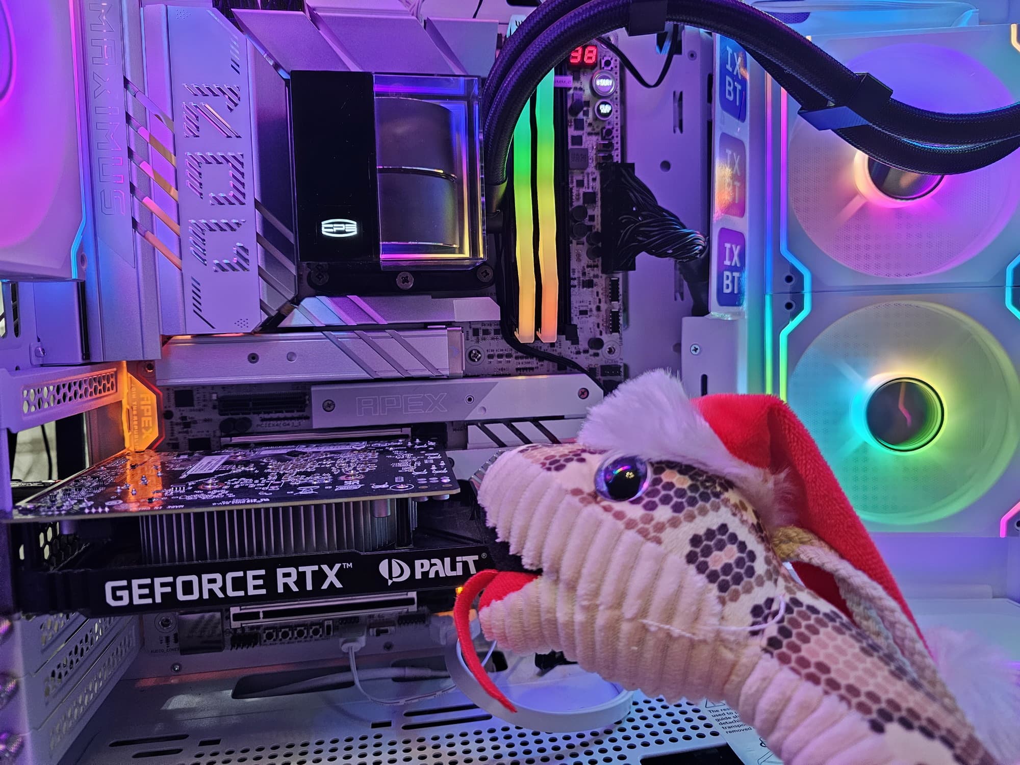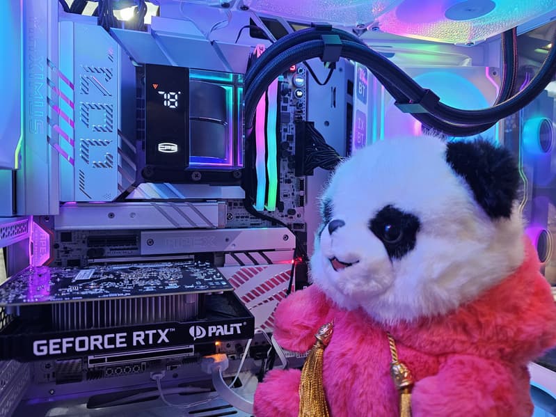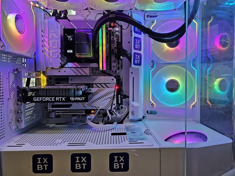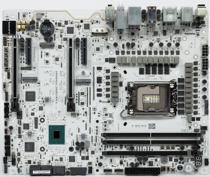 В арсенале платы также есть 4 порта SATA и 8 разъемов для вентиляторов. Система питания процессора очень и очень мощная, способная обеспечить работу любых совместимых процессоров с приличным запасом на разгон. Плата имеет грамотную систему охлаждения каждого потенциально греющегося элемента, включая накопители в слотах M.2 (термопрокладки для охлаждения накопителей в 4 слотах на самой плате есть с обеих сторон). Сетевые возможности хороши: быстрый проводной контроллер (5 Гбит/с) и один самый современный беспроводной — Wi-Fi 7 + Bluetooth 5.4. В числе плюсов можно упомянуть красивый белый дизайн самой платы со стильной и умеренной подсветкой, а также широкие возможности для подключения дополнительных RGB-устройств.