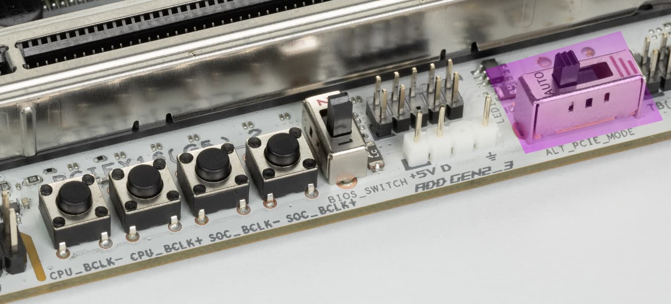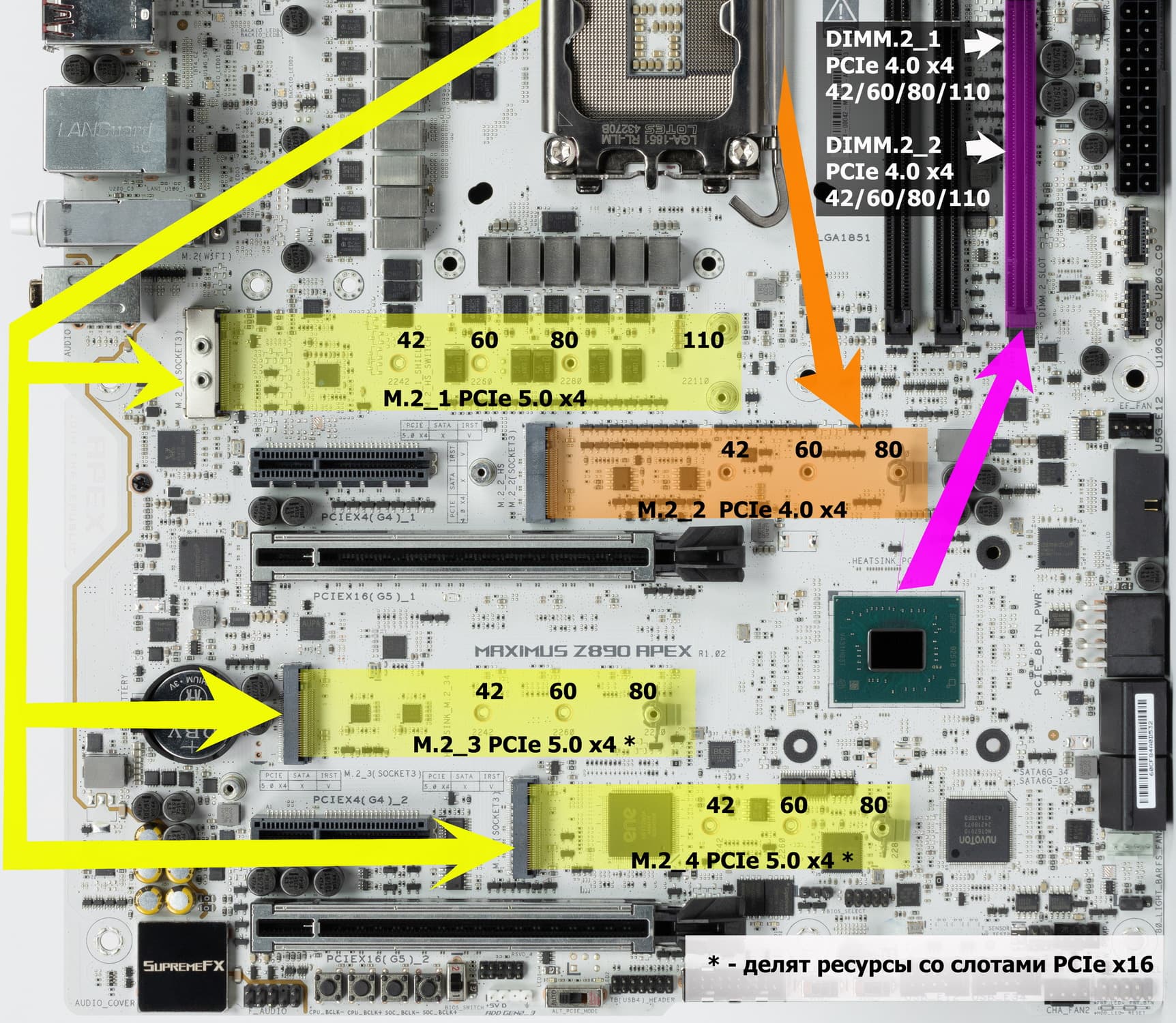 Первые четыре слота получают данные от CPU, при этом M.2_3 и M.2_4 получают PCIe 5.0, деля ресурсы со слотами PCIe x16_1/2 (о чем я уже выше рассказывал), M.2_1 штатно получает от процессора PCIe 5.0, а M.2_2 получает от процессора PCIe 4.0.