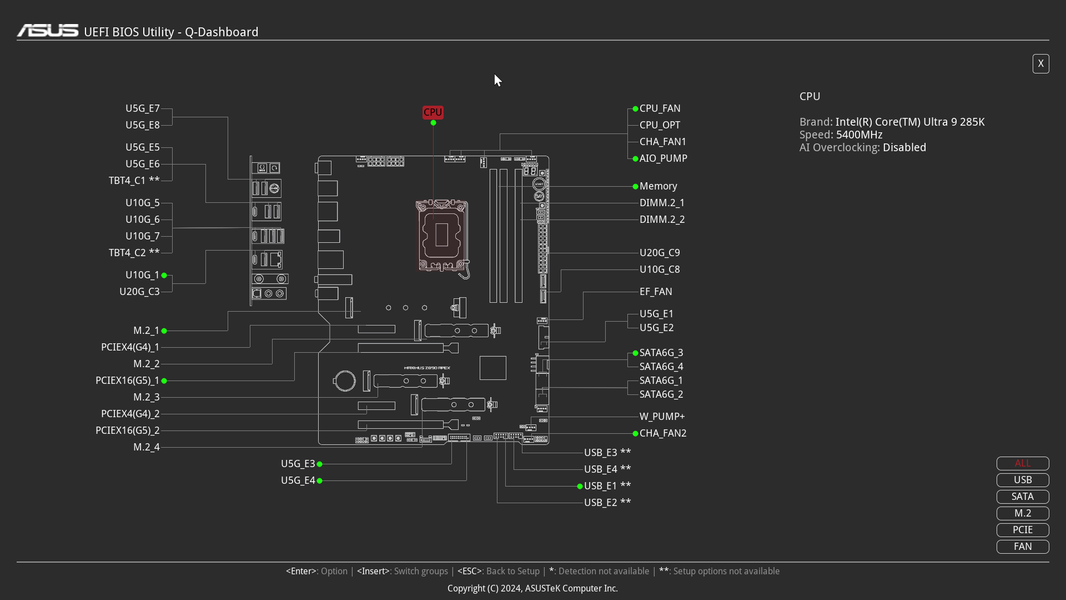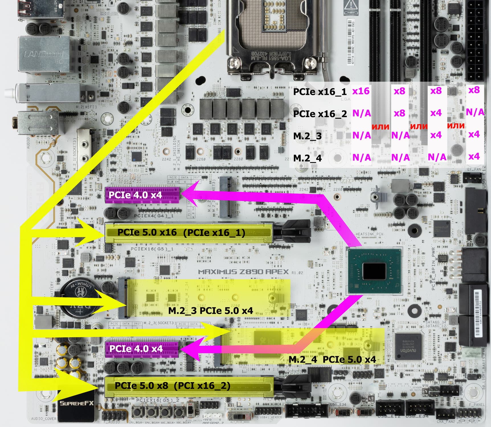 Теперь посмотрим выше на то, как работают процессоры в данной конфигурации. У CPU Core Ultra 2xx всего 24 линии PCIe, из них 4 линии версии PCIe 5.0 отведены на порт М.2 (M.2_1), 4 линии версии PCIe 4.0 отведены на порт М.2 (M.2_2) . Оставшиеся 16 линий PCIe 5.0 надо делить на слоты PCIe x16_1/2 и два слота M.2 (M.2_3/4). Вариантов переключения несколько: