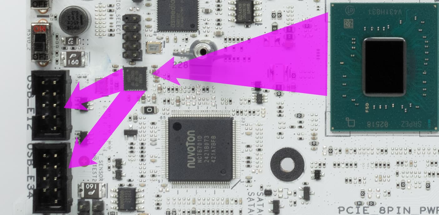 - 8 портов USB 3.2 Gen1: 4 реализованы через контроллер ASMedia ASM1074 (на него потрачена 1 линия USB 3.2 Gen1 от Z890) и представлены на задней панели портами Type-A (синего цвета); остальные 4 реализованы через 2 контроллера ASMedia ASM3142 (на них потрачены 2 линии PCIe 4.0 от Z890) и представлены 2 внутренними разъемами на материнской плате (каждый на 2 порта);