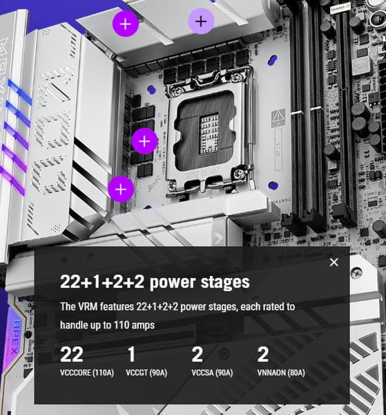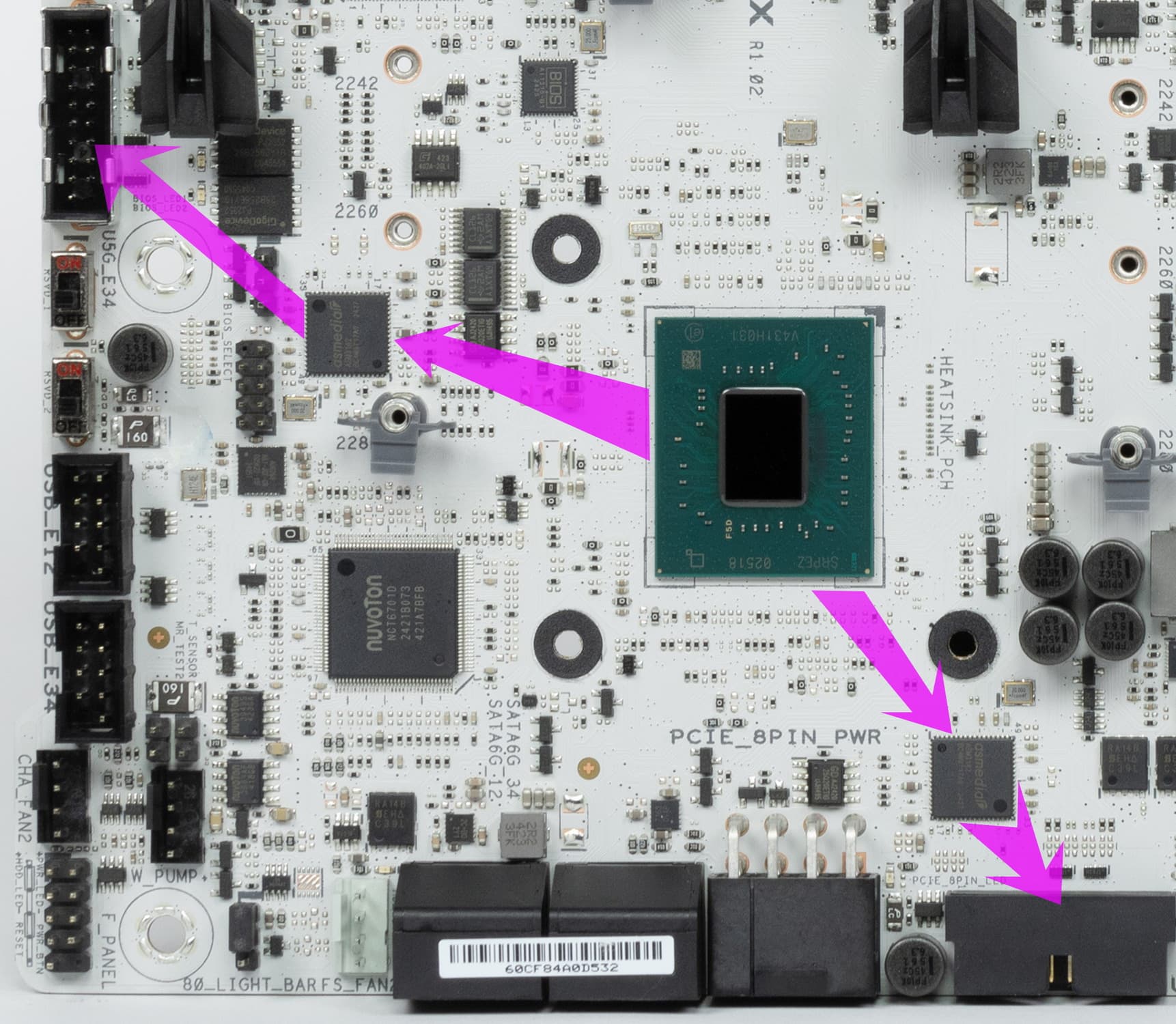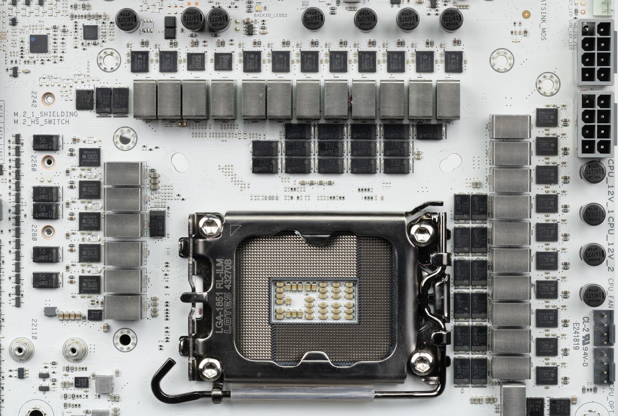 Схема питания процессора выполнена по схеме 22+1+2+2 (всего 27 фаз: 22 на VCore (ядро процессора), 1 на iGPU (интегрированное графическое ядро), 2 на VCCSA (System Agent, кольцевая шина) и 2 на VNNAON (управление энергосбережением).