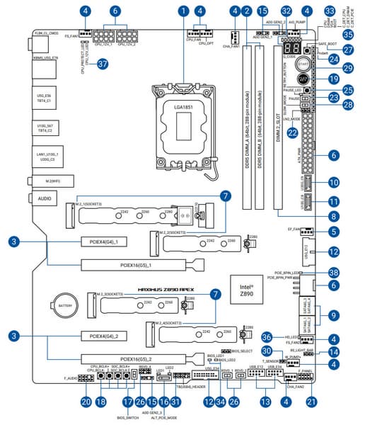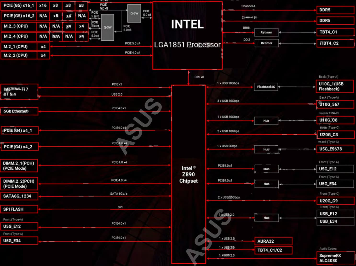 Кроме USB-портов, к которым мы подойдем позже, чипсет Z890 обладает 24 PCIe линиями PCIe 4.0 и 8 SATA портами. Считаем, сколько линий Z890 уходит на поддержку (связь) с тем или иным элементом: