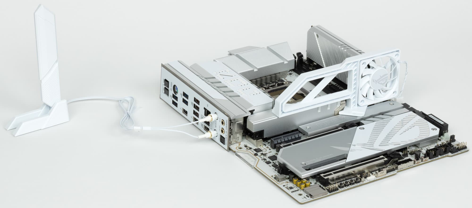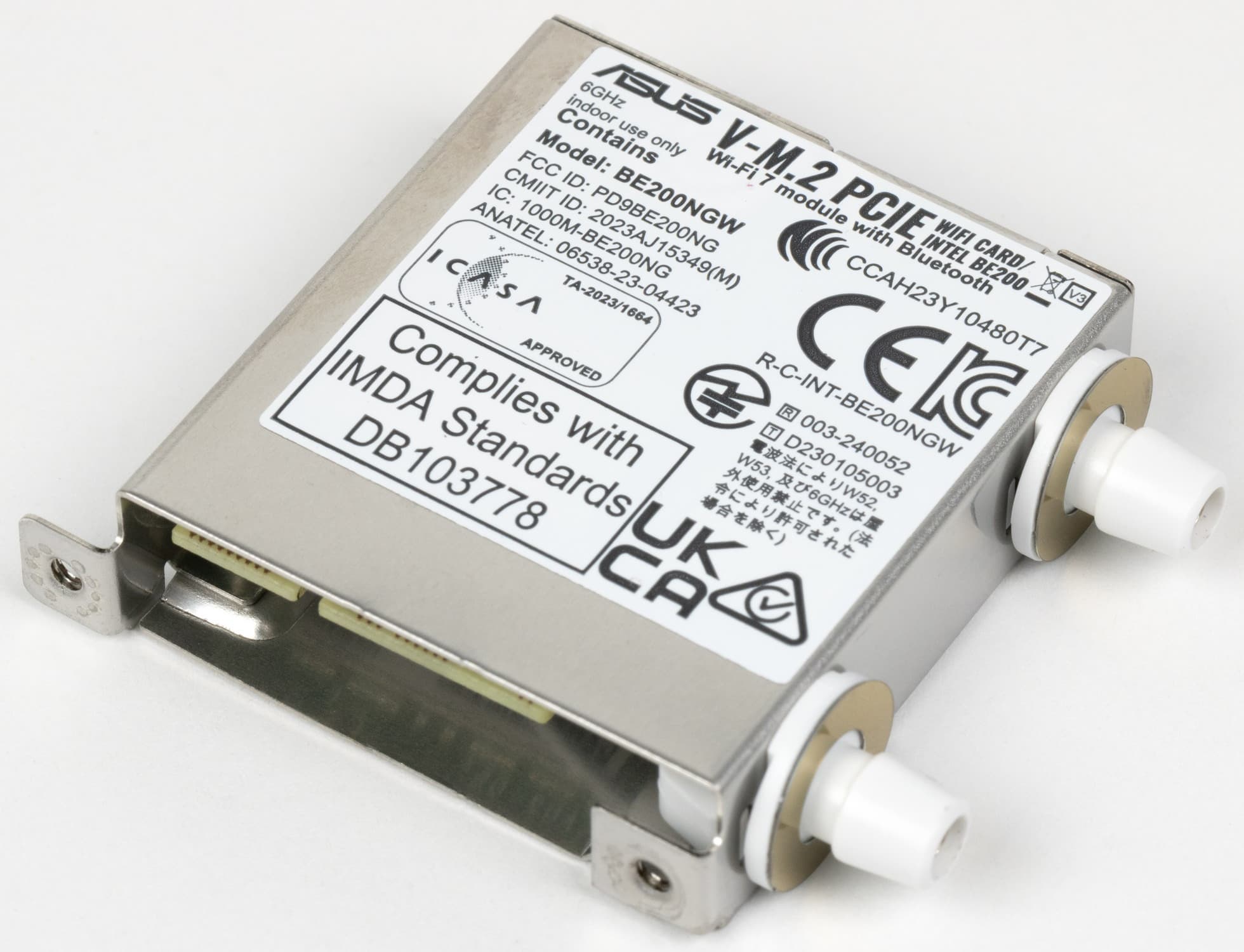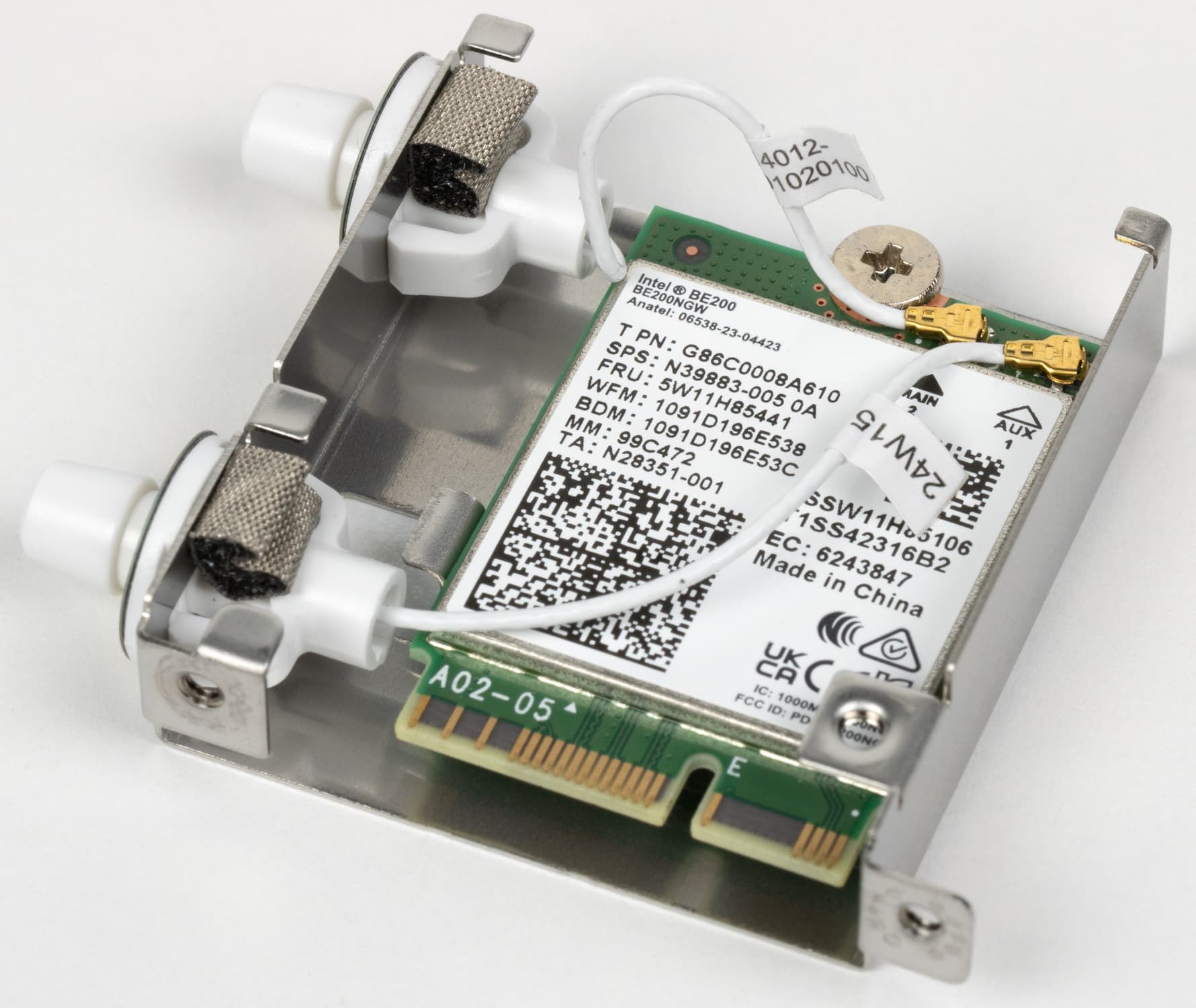 Имеется и комплексный беспроводной адаптер на контроллере Intel BE200, через который реализованы Wi-Fi 7 (802.11a/b/g/n/ac/ax/be, 2,4/5/6 ГГц) и Bluetooth 5.4. Он установлен в слот M.2 (E-key), и его разъемы для выносных антенн выведены на заднюю панель.