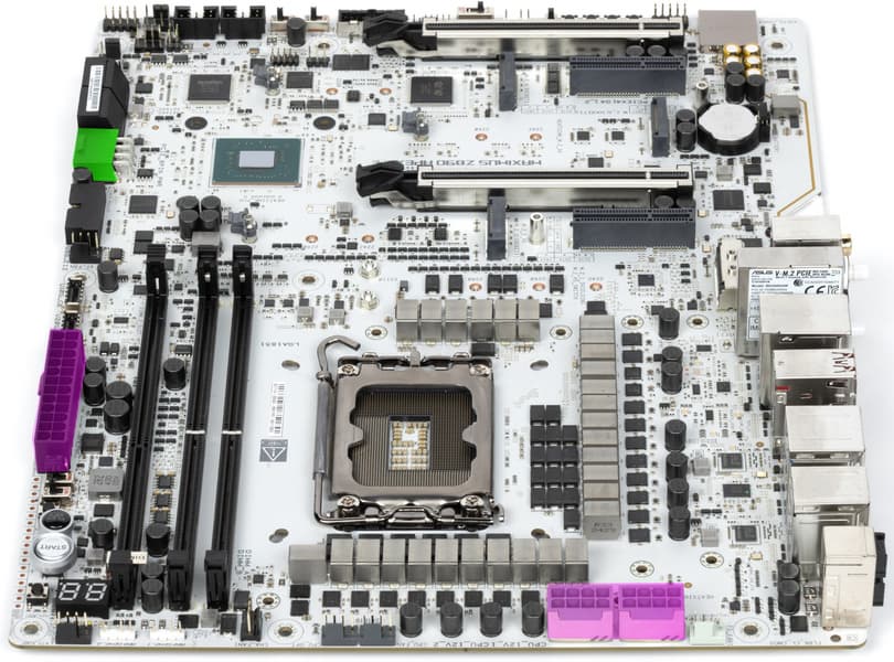 Для питания платы на ней предусмотрены 4 разъема: в дополнение к 24-контактному ATX (он на правой стороне платы (на фото — слева) здесь есть еще два 8-контактных EPS12V (они имеют металлическое армирование), а также 8-контактный PCIe для поддержки усиленного питания USB 3.2 Gen2x2 Type-C (с целью обеспечения быстрой зарядки мобильных устройств – до 60 Вт – он отмечен зеленым цветом).