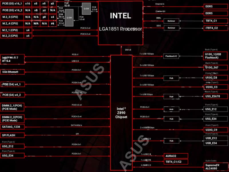 | USB-порты | 4 × USB 2.0: 2 внутренних разъема на 4 порта (AU6260) 4 × USB 3.2 Gen1: 2 внутренних разъема на 4 порта (ASM3142) 4 × USB 3.2 Gen1: 4 порта Type-A (синие) (ASM1074) 4 × USB 3.2 Gen2: 4 порта Type-A (красные) (Z890) 1 × USB 3.2 Gen2: внутренний разъем Type-C (Z890) 1 × USB 3.2 Gen2x2: внутренний разъем Type-C (Z890) 1 × USB 3.2 Gen2x2: 1 порт Type-C (Z890) 2 × USB4: 2 порта Type-C (Thunderbolt4) |