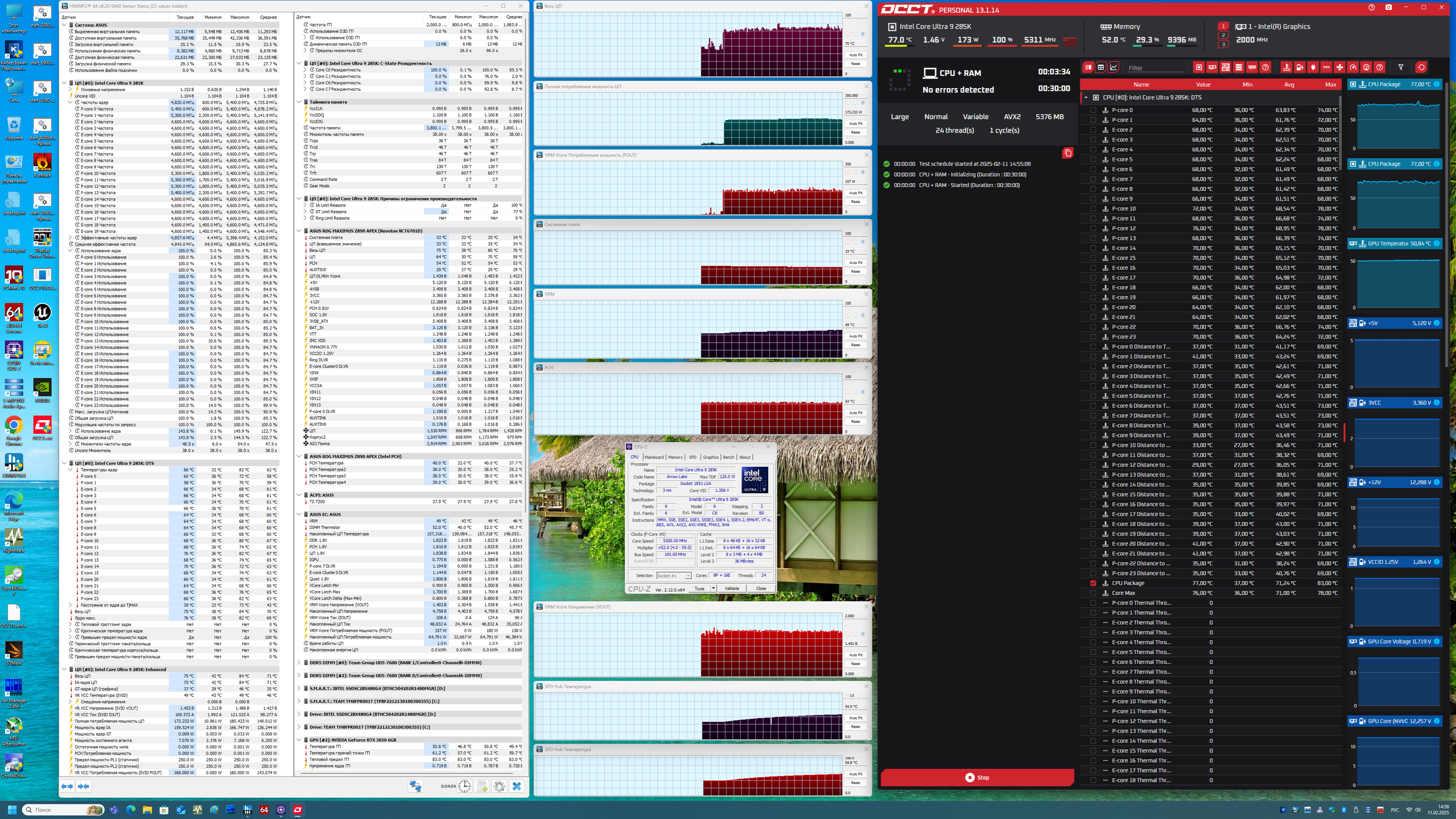 Поиграв с общими настройками разгона, я смог получить максимальные частоты работы процессора около 5,7/4,9 ГГц. При этом потребление процессора выросло до 190 Вт. Реальная производительность изменилась в бенчмарках на пару процентов, в рендеринге Adobe Premiere (все аппаратные оптимизации через CUDA были отключены) – на 3%.