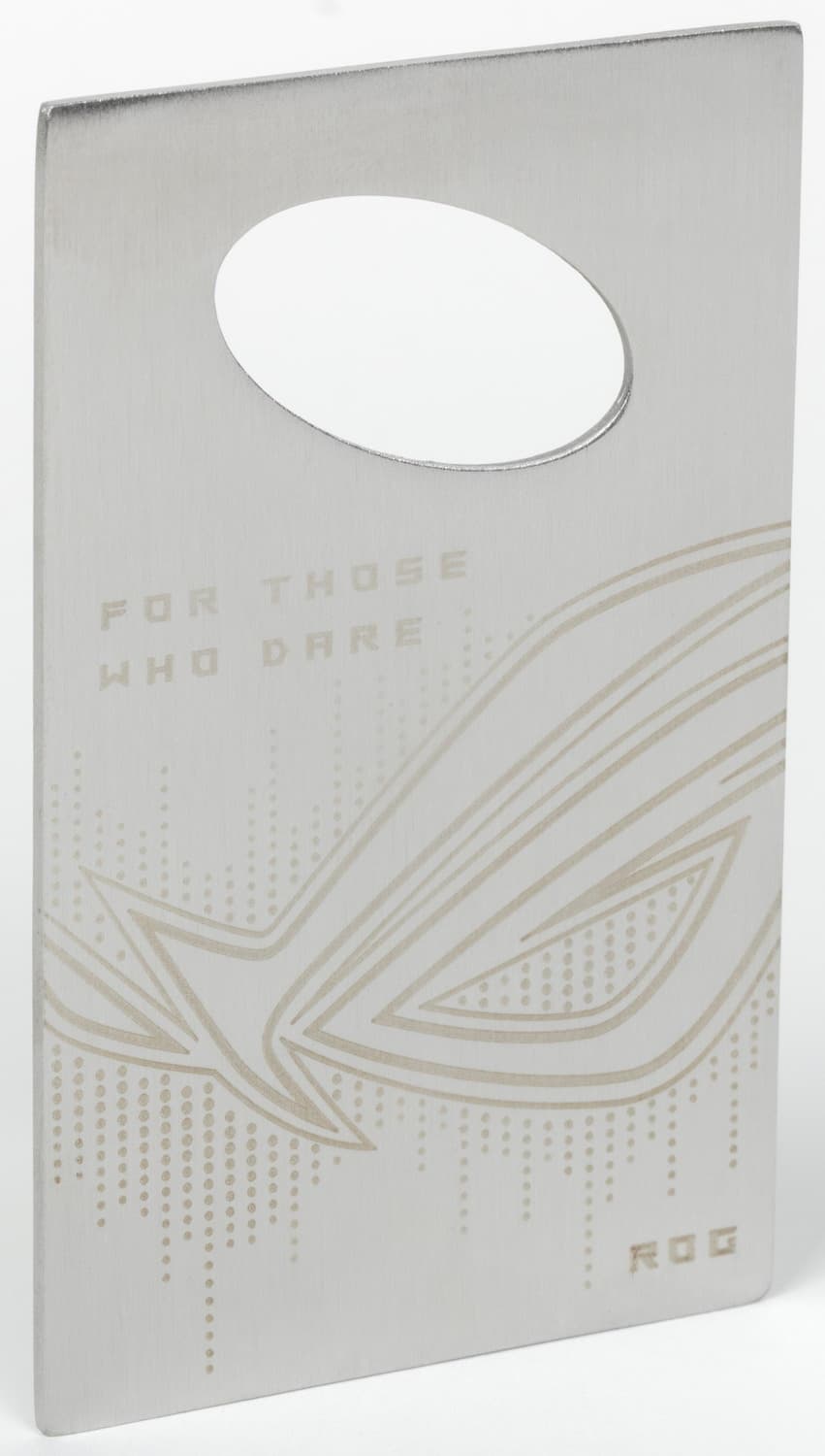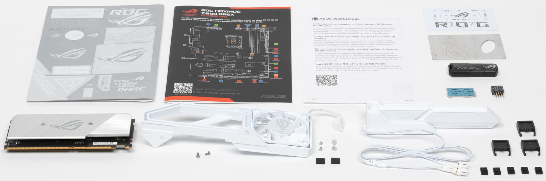 В комплект поставки входят: краткое руководство пользователя, антенна встроенного Wi-Fi-модуля, фирменный адаптер для передней панели, бонусные стикеры, запасные держатели накопителей в слотах M.2, запасные термопрокладки, карта Q-DIMM.2 для подключения дополнительных накопителей форм-фактора M.2, дополнительный вентилятор (с держателем) для охлаждения модулей памяти, членская карточка клуба ROG, сувенирная открывалка бутылок, накопитель типа Flash-drive с ПО.