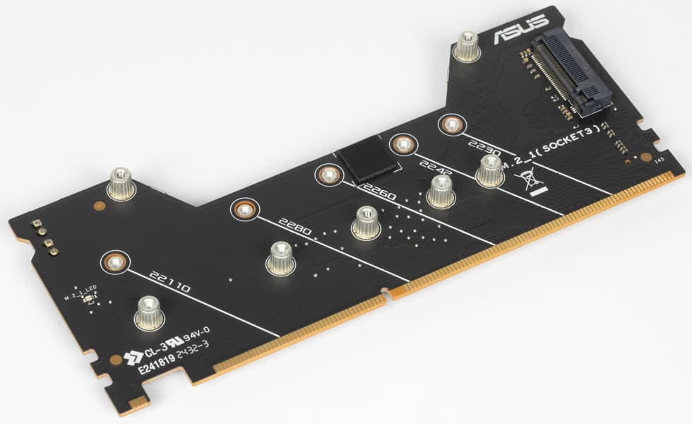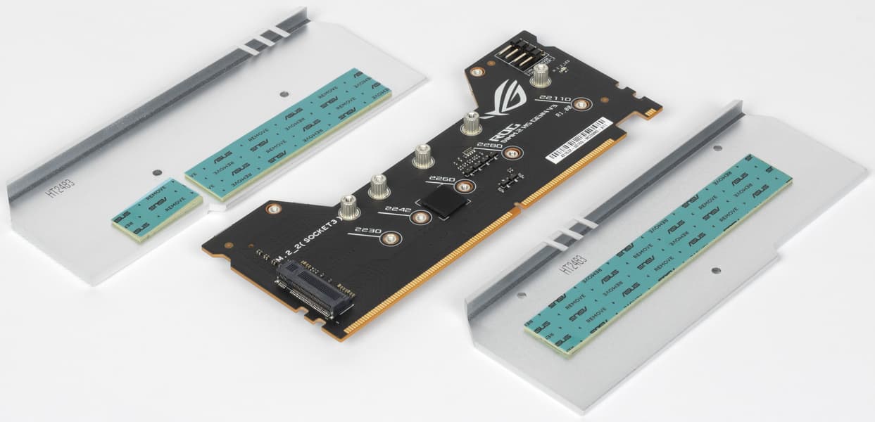 Два оставшихся слота M.2 реализованы через фирменную карту расширения Q-DIMM.2, вставляемую в специальный слот рядом со слотами для ОЗУ.