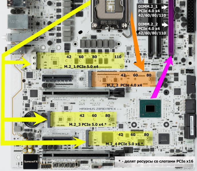* - слоты M.2_3 и M.2_4 делят ресурсы со слотами PCIe x16_1/2, детали - ниже