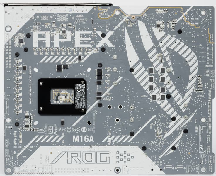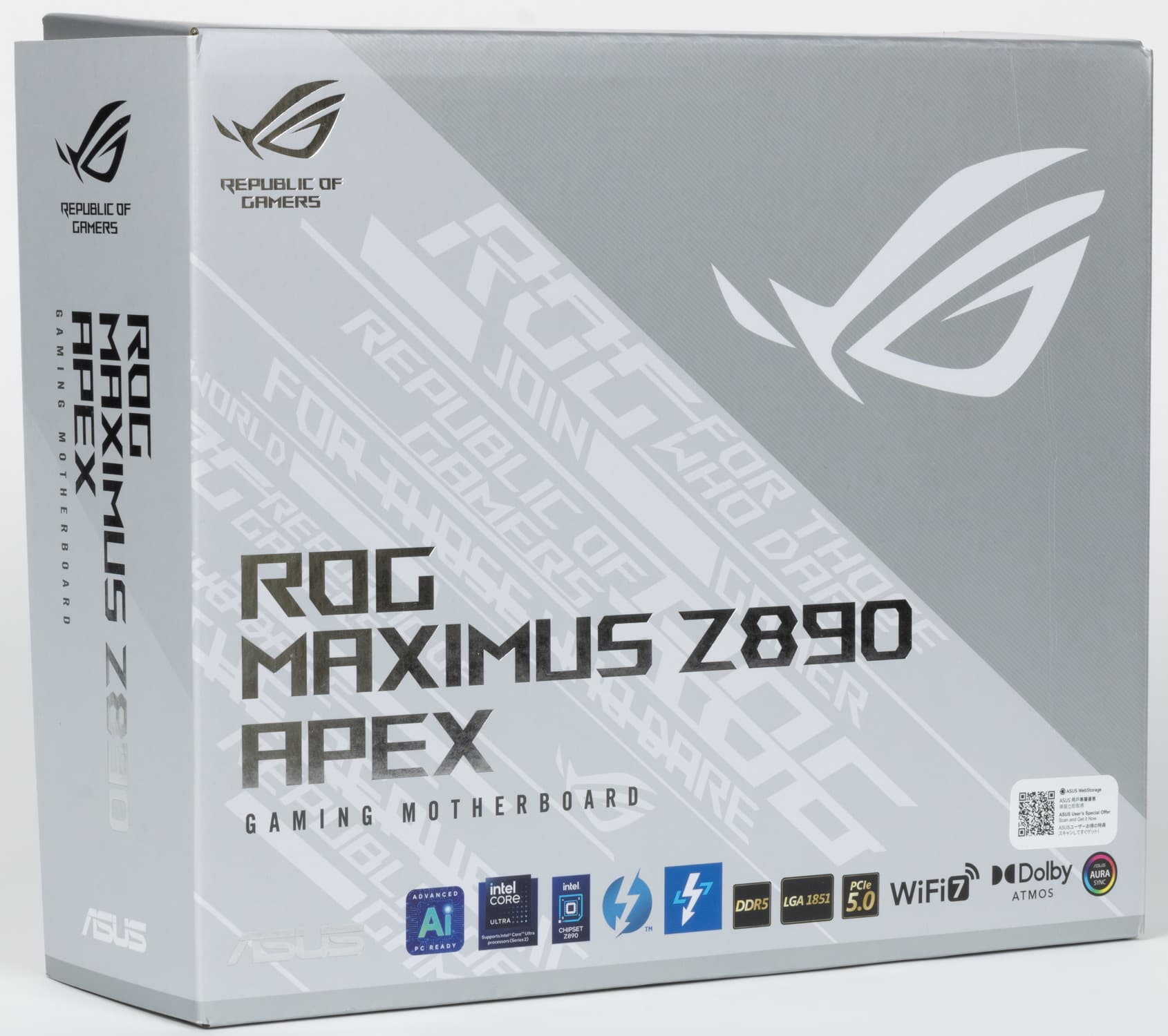 Asus ROG Maximus Z890 Apex поставляется в большой и толстой коробке серо-белого дизайна серии ROG (символизирующего раскраску самой платы). Комплект размещен под платой в отдельных отсеках.