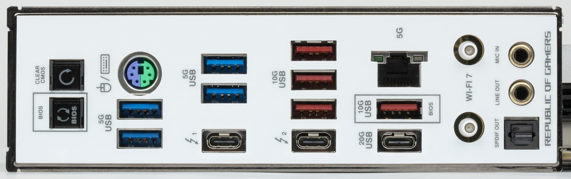 | Разъемы на задней панели | 2 × USB4 (Type-C) 4 × USB 3.2 Gen2 (Type-A) 4 × USB 3.2 Gen1 (Type-A) 1 × USB 3.2 Gen2x2 (Type-C) 1 × USB 3.2 Gen2 (Type-C) 1 × RJ-45 2 аудиоразъема типа миниджек 1 × S/PDIF (оптический, выход) 2 антенных разъема кнопка сброса CMOS кнопка перепрошивки BIOS — Flash Back |